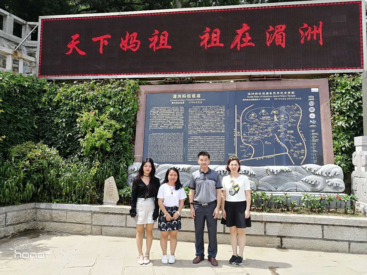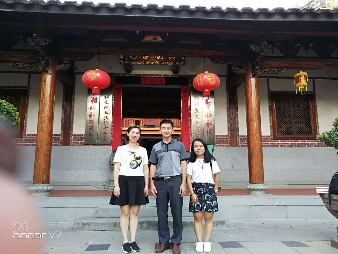 Last semester saw four groups of our students win four naitonal-level innovation projects in the competions with others in our university. One of the Project is A Study of the Mazu Culture on Meizhou Island . It happens that Ms Zhang Ling and I are the mentors for our two students Guo Yanyan and Gao Xuejing who are in charge of the project. Therefore we need some field trips. We first paid a visit to the Original Temple to Mazu. One of the directors of the Board of the Original Temple to Mazu, Mr. Zhang received us and shared us lot of informaiton and books on Mazu, which are very helpful for the project. Then we looked around the temple. There are many magnificent buildings, carvings and scripts in memory of Goddess Mazu. Finally we came to the Mazu Cultural Exchange Association of China. Mr. Yan and Mr. Chen, heads there received us warmly and gave us a very enlightening or even unheard introduction about the origin of the Mazu belief and the present influence of her belief. The hightight of the belief in their opinions is to uphold kindness and ethics which are positive these days.They think the guard and guide of the beleif is vital for all the folks who believe.