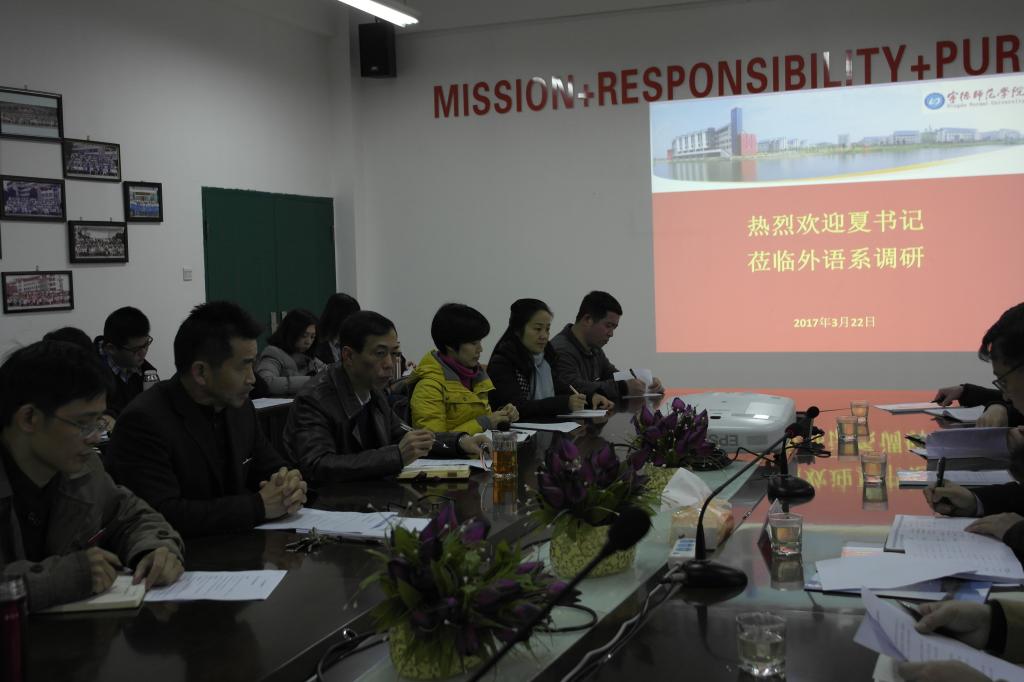 3月22日下午三点,公司党委书记夏良玉一行来到英语系调研工作,并与全系老师们展开座谈。陪同调研的还有公司党政办、人事处、教务处、资产后勤处有关领导。