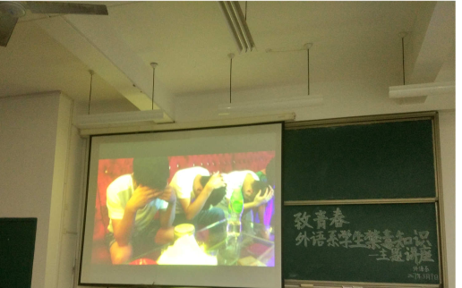 随之播放的是与毒品知识相关的视频讲座。视频着重在开头介绍了现如今市面上的几种主要毒品,其目的在于让我们认识毒品的种类。话锋一转,说道:“现如今许多青少年也沾染上了毒品”。使我们意识到毒品其实离我们很近。增加了我们的危机意识。再以几个青少年的父亲吸毒导致家庭悲剧的案例,阐明了毒品会使人家破人亡的严重危害性。