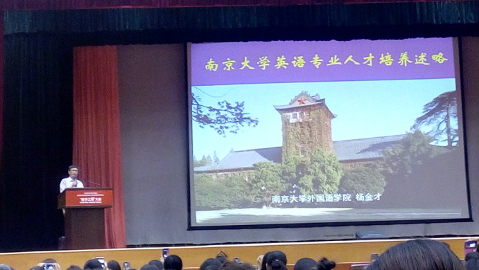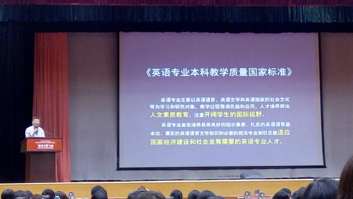 蒋洪新教授就“国家标准指导下的英语专业教学改革”进行了较为全面的介绍,对于“国标”研制背景、主要理据、总体框架、分类说明、分类培养方案等进行了细致说明;杨立民教授以精读课程为例介绍了英语专业基础课程教学思路与方法,提出了语言、文化和思辨能力是三位一体的关系;梅仁毅教授以明确目标、突出重点、联系实际为主题,介绍了国别文化课程建设的思路;杨金才教授以南京大学为例,介绍了英语专业人才培养模式,强调要突出批判性思维的训练和培养;贾玉新教授总结了大会的三个关键词:国标、思辨能力与跨文化交际,强调思辨能力是跨文化交际的核心,把思辨能力纳入跨文化交际能力意义重大;韩宝成教授介绍了北京外国语大学拟推出的国际人才评价方式,国际人才英语考试ETIC,该认证服务职场、立足应用、聚焦沟通,以“分类优秀”为指导实施通用人才、商务人才、高端人才、翻译人才的类别考试。