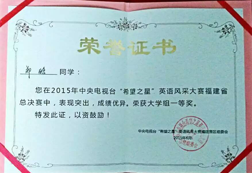 近日,2015年度中央电视台“希望之星”英语风采大赛福建省总决赛圆满落幕,公司2012级外语系郑晗同学获大学成人组省一等奖,并将代表福建赛区参加全国总决赛,2014级中文系熊楠同学和2012级外语系黄越获省大学成人组省二等奖。