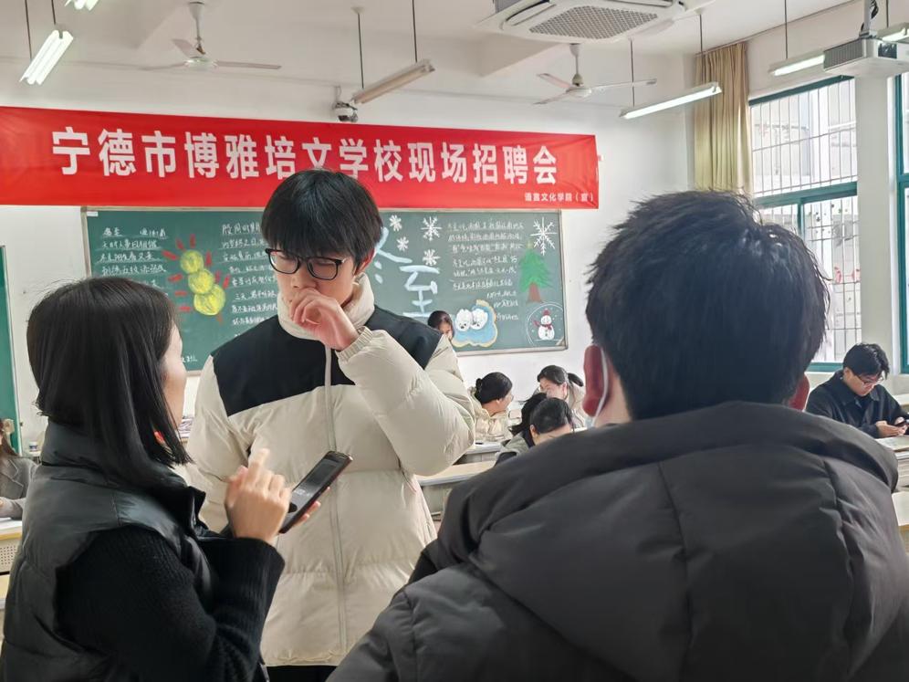 为精准对接教育行业人才需求,助力学子高质量就业,2026年1月13日下午三点,宁德市博雅培文学校专场招聘会顺利举行,我院英语师范、汉语言文学师范等专业学子积极参与应聘。