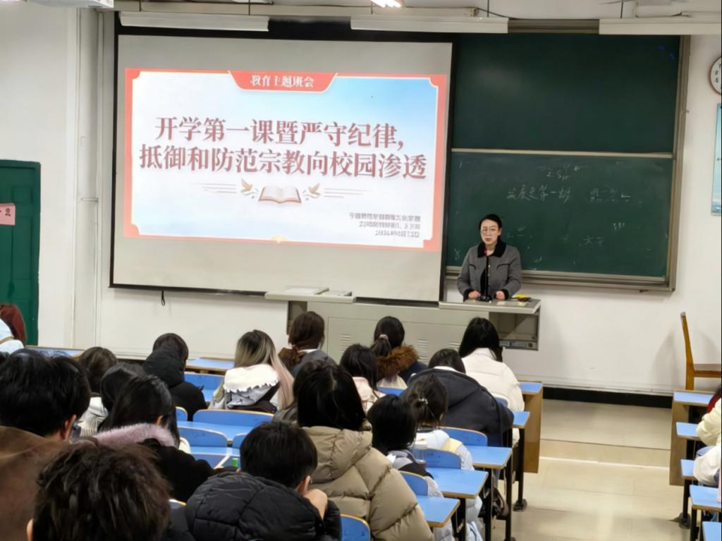 班会中,辅导员重点围绕开学纪律、校园管理及宗教政策展开讲解。一方面明确新学期课堂纪律、安全管理等要求;另一方面解读党的宗教工作基本方针,结合案例剖析宗教渗透危害,强调校园严禁任何形式宗教活动,引导员工自觉抵制非法宗教传播,树立科学世界观。