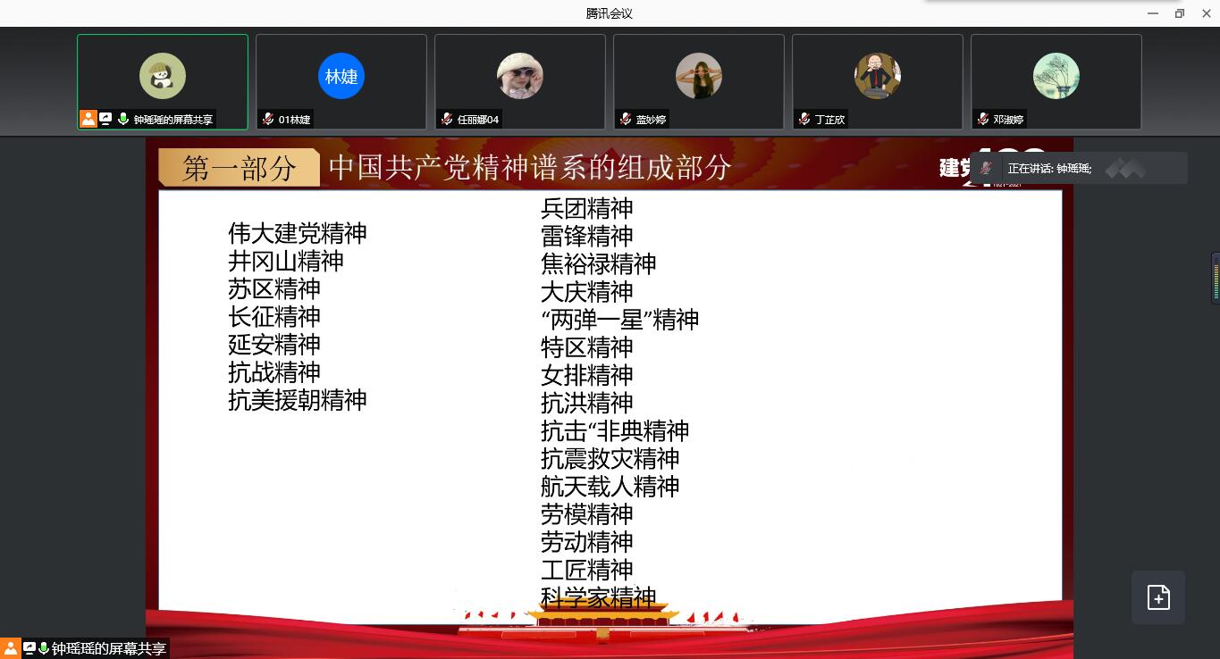 2021年10月11日,语言与文化学院员工第二党支部以三个党小组为单位在线上开展主题为“学习精神谱系,汲取奋进力量”的党日学习活动。会上,党小组成员们:重温习近平总书记在中国共产党成立100周年大会上重要讲话精神,学习了《党的伟大精神永远是党和国家的宝贵精神财富》,中国共产党人的精神谱系及《人民日报》近期发表关于中国共产党人精神谱系的系列评论员文章等,党小组成员联系自身学习与生活,积极讨论,交流心得。