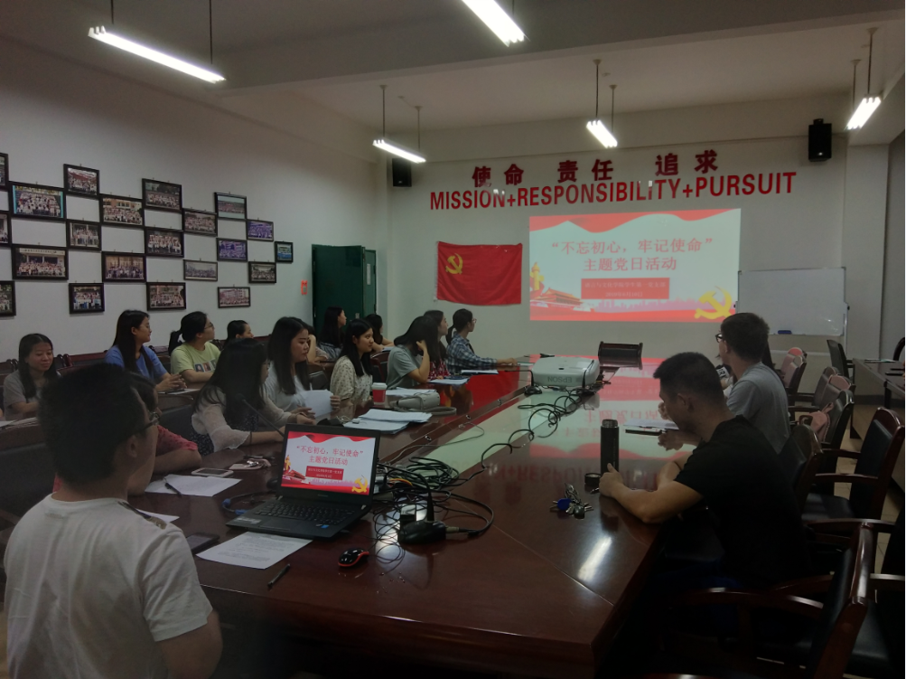 为强化党员意识,语言与文化学院员工第一党支部组织支部党员于2019年6月10日晚7点在求知楼A407开展学习“不忘初心、牢记使命”主题党日活动,支部全体党员参加学习。