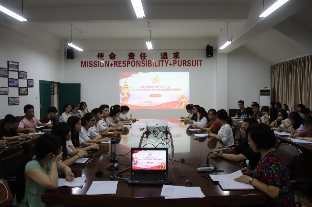 与会人员一起观看了5月2日的习近平总书记考察北大时长15分钟的央视《新闻联播》之后,郭泽林、李佳怡和严茹婷等三位同学和辅导员林猤老师结合各自学习、工作情况,先后发表了对青春的看法以及对责任与担当的理解,分享自己在学习习近平总书记重要讲话精神的收获和感悟。参会的同学们也纷纷表示,牢记习近平总书记对广大青年的嘱托,按照习近平总书记爱国、励志、求真、力行的要求,忠于祖国,忠于人民,志存高远,坚定信念,刻苦学习,求真学问,练真本领,为国争光、为民造福。
