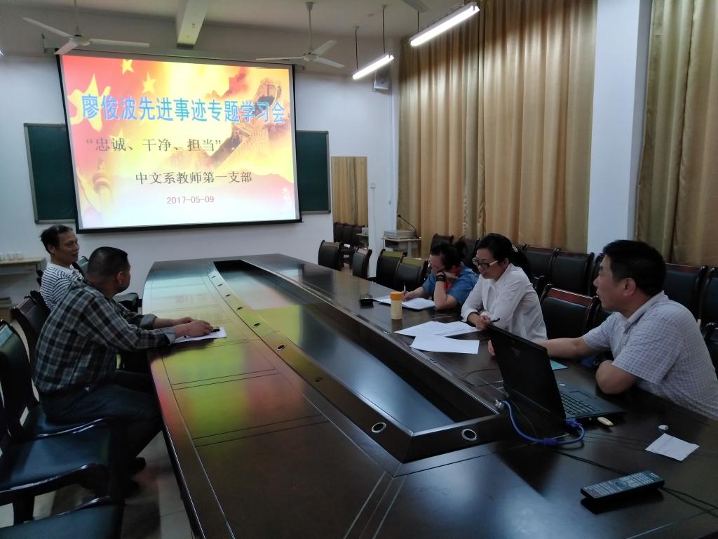 5月9日,汉语言文学系教师第一支部全体党员在求真楼BC305举行廖俊波先进事迹专题学习会。党支部书记徐晓春主持学习会。