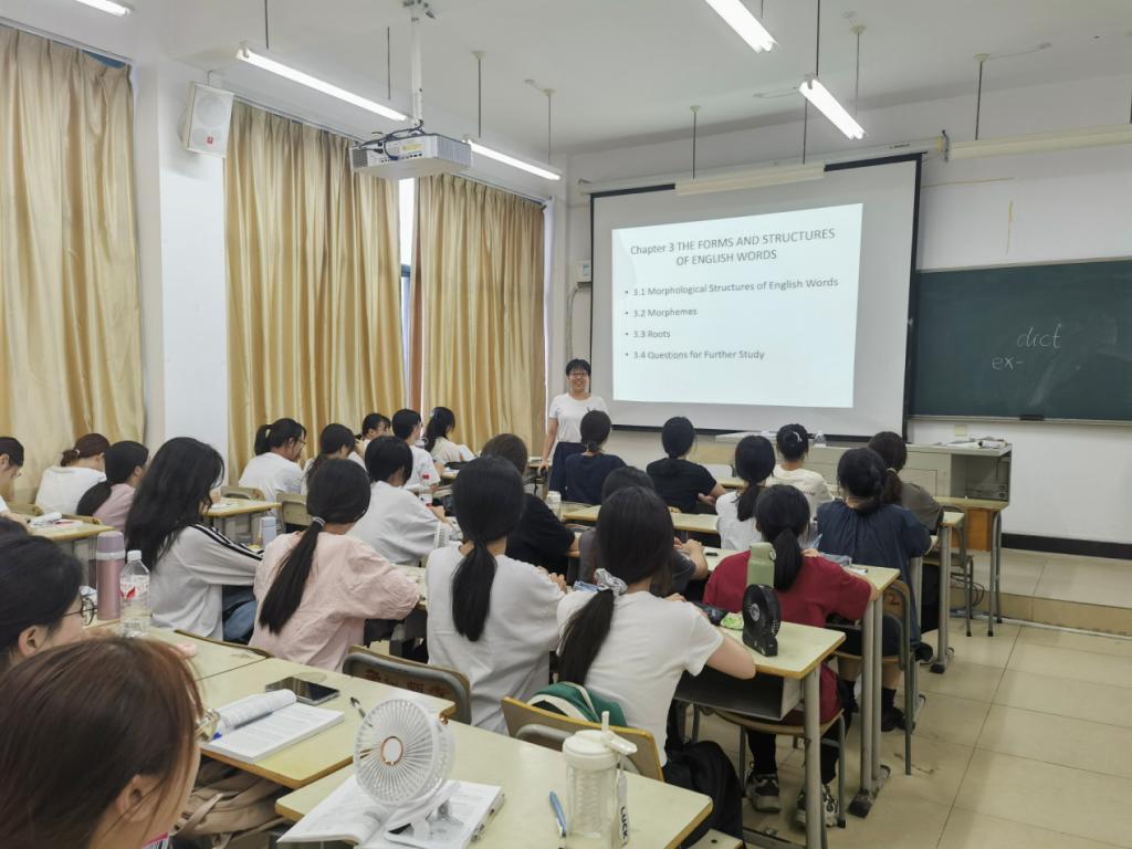 9月19日下午2023级英语(师范)1班题为《英语词汇的形式与结构》的公开课上,陈姗姗老师以复习“词”的特点和分类导入新课,分析了英语词汇的形态结构、语素的分类和常用词根。