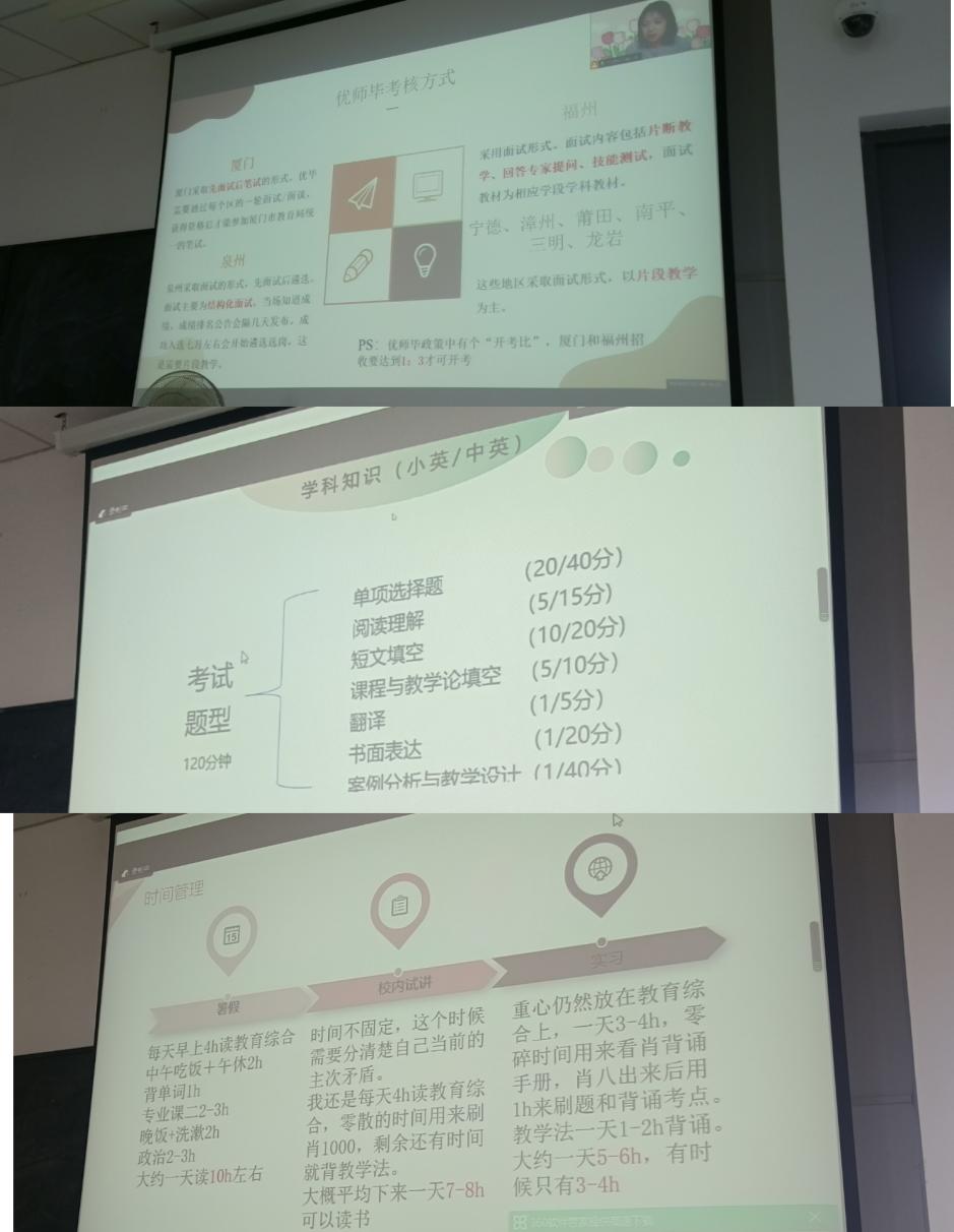 在考研经验分享环节中,李传秋学姐首先强调了时间管理的重要性,其次分享了各科的备考经验和备考教材。最后强调了保持良好心态和规律作息的重要性,并鼓励大家积极备考。在考编经验分享环节中,阮爱莹学姐分别从笔试和面试两个模块入手,分享了相应的备考策略,并提供了一些好用的备考教材和资源,供同学们参考。在校招经验分享环节中,黄宇昕学姐从如何界定优秀师范毕业生,关于优秀师范毕业生的建议,关于校招的建议等方面入手,强调了在校期间努力提高专业成绩的重要性以及参加老员工创新创业大赛等活动的必要性。在分享会的最后,几位学姐都强调了心态的重要性。她们表示,无论是考研、考编还是校招,都需要有一颗坚韧不拔的心。面对困难和挑战时,要保持积极的心态和坚定的信念,相信自己一定能够成功。同时,她们也鼓励学弟学妹们珍惜大学时光,努力学习、积极实践、提升自己,为未来的职业生涯打下坚实的基础。