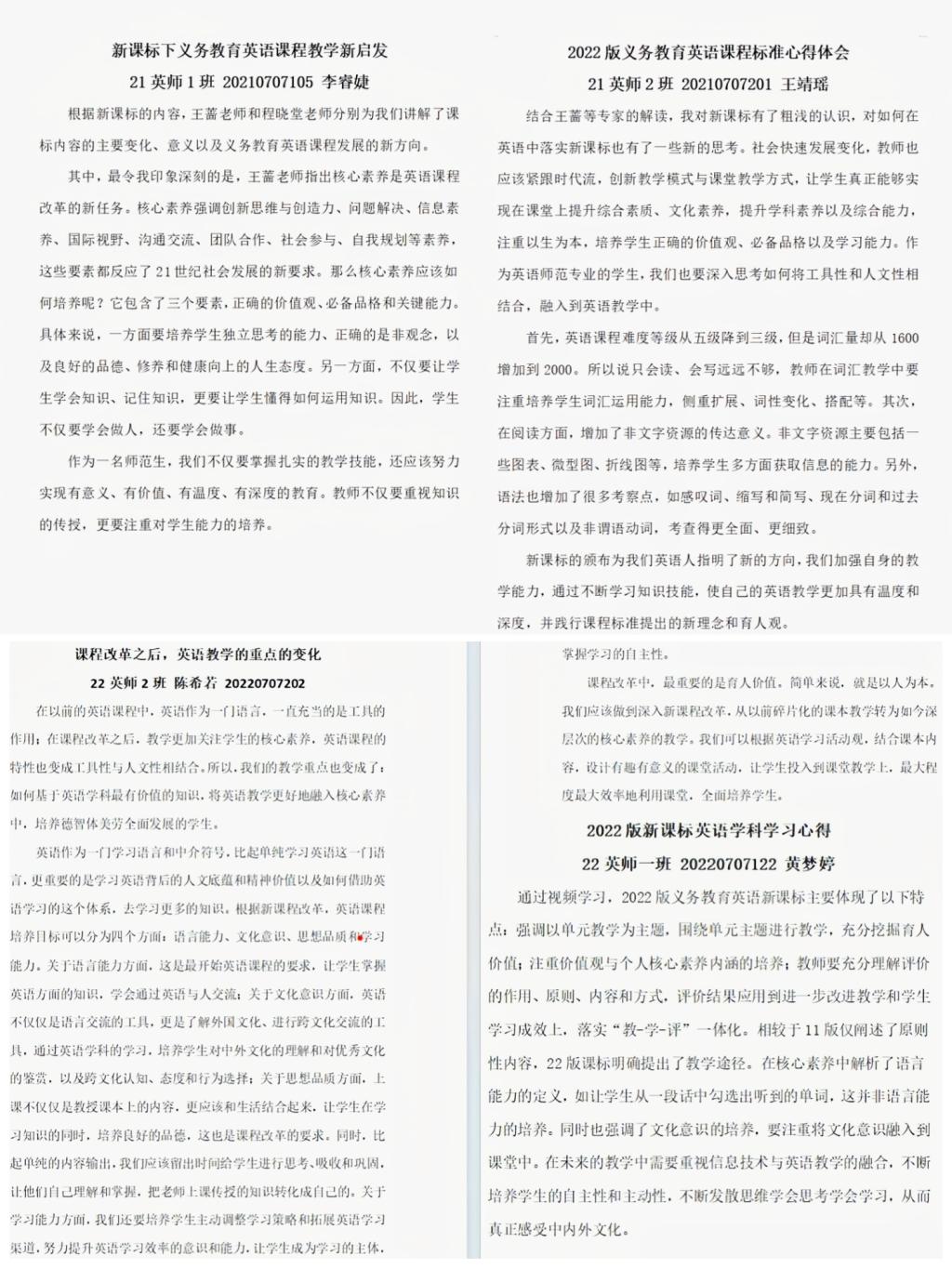 在个性化培养周期间,本实验班同学共计依托腾讯视频线上资源收看了北京师范大学王蔷教授关于《<义务教育英语课程标准(2022版)>解读》和程晓堂教授关于《义务教育英语课程的新方向》等英语教育改革前沿系列讲座共计10场,撰写心得体会共计86篇。
