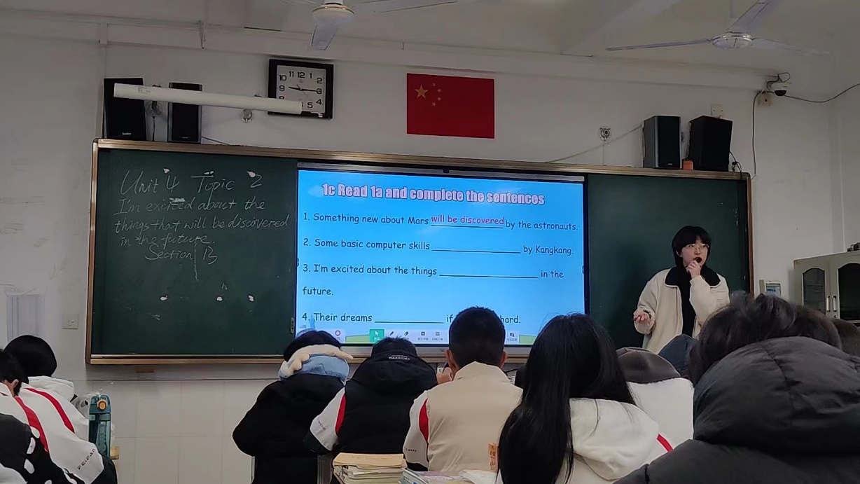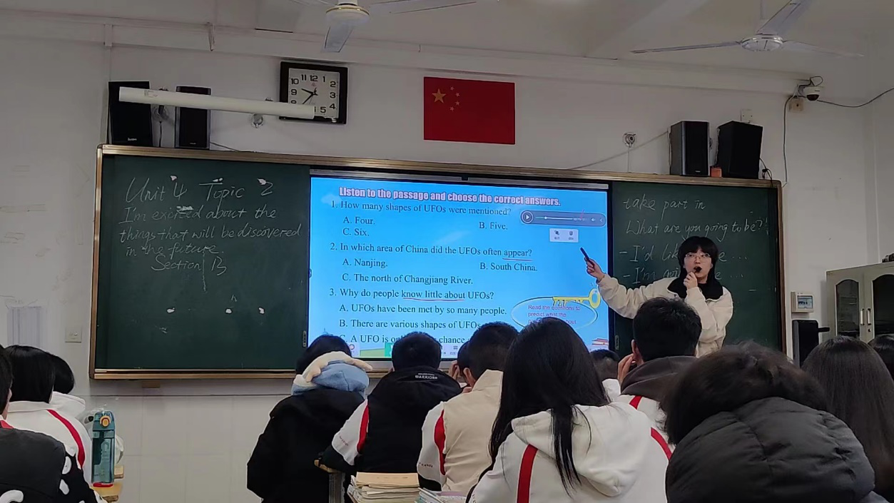 本次汇报课是由伊思齐同学在初三(15)班进行课程的教学展示,授课单元为仁爱版九年级Unit 4 Topic 2 Section B I'm excited about the things that will be discovered in the future校内外指导老师以及实习队成员到场听课。汇报课教学内容丰富,结构紧凑,教师教态自然大方,师生配合自然,课堂整体氛围良好。
