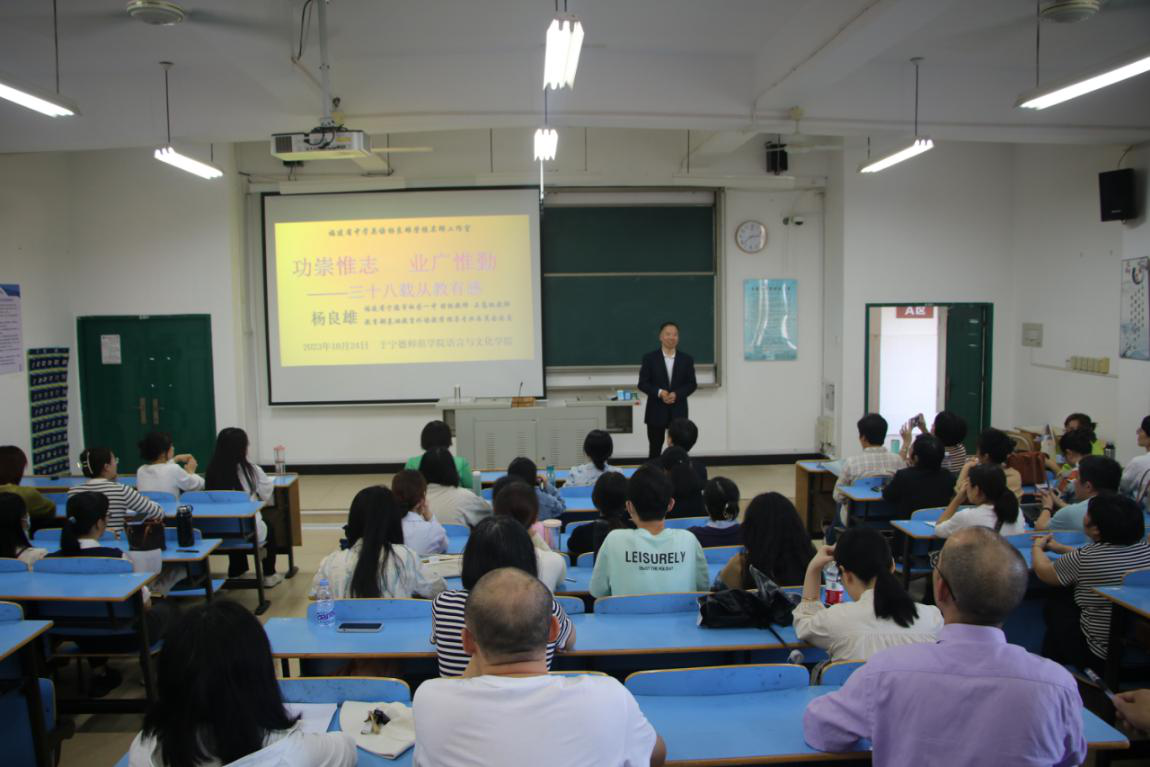 为扎实推进“弘扬教育家精神,争做新时代大先生”师德主题学习教育活动,2023年10月24日下午,语言与文化学院举办“师德大讲堂”,邀请全国师德先进个人、柘荣一中正高级教师、特级教师、福建省首批教学名师名师杨良雄作题为《功崇惟志,业广惟勤——三十八载从教有感》的专题讲座。本次讲座由公司党委书记张晓芳主持,全体教职工和师范专业员工等100多人参会。
