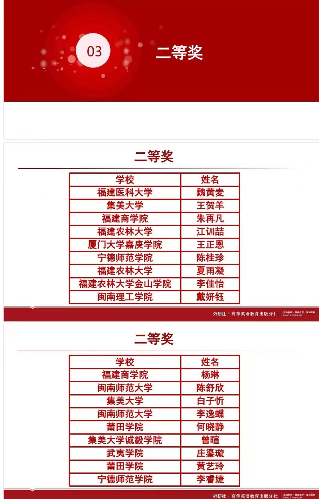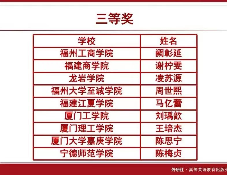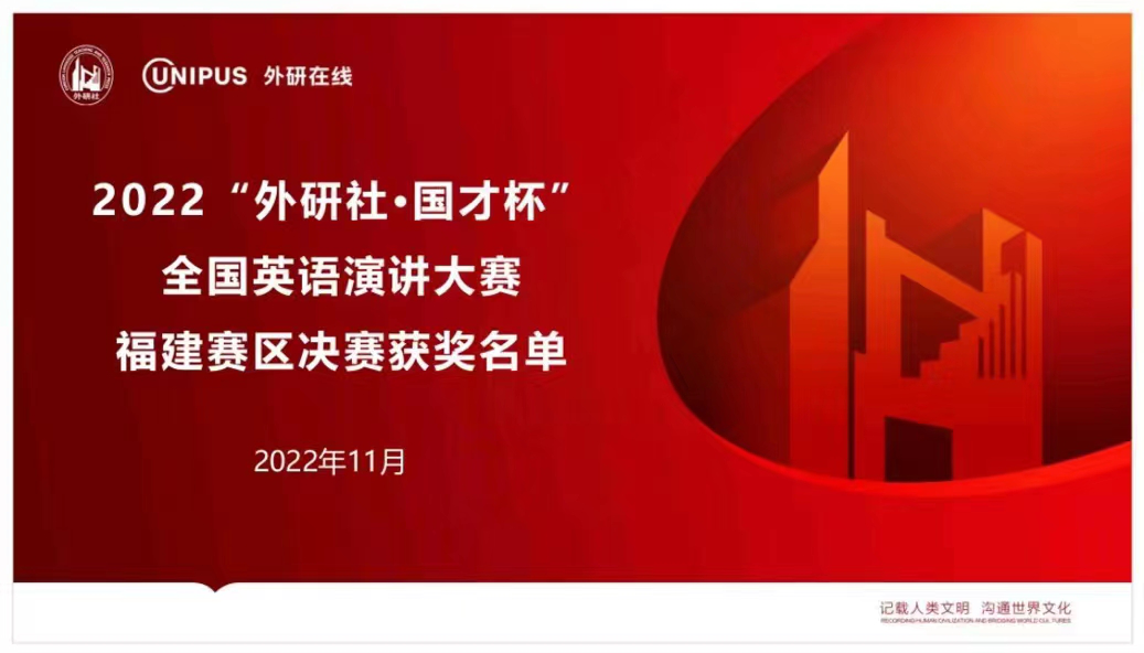 2022年11月13日,2022“外研社·国才杯”全国英语演讲大赛福建赛区决赛落下帷幕。来自全省39所高校的92名选手进入英语演讲大赛复赛,大赛设特等奖三名,一等奖10%,二等奖20%和三等奖30%。本次比赛采取线上录制视频和现场直播的方式进行。经过激烈角逐,公司3名员工在决赛中脱颖而出,获得英语演讲比赛(福建赛区)二等奖2项,三等奖1项的好成绩,其中,2021级英语(师范)专业李睿婕、2021级酒店管理专业陈桂珍喜获二等奖,2020级英语(师范)专业陈梅贞获得三等奖。