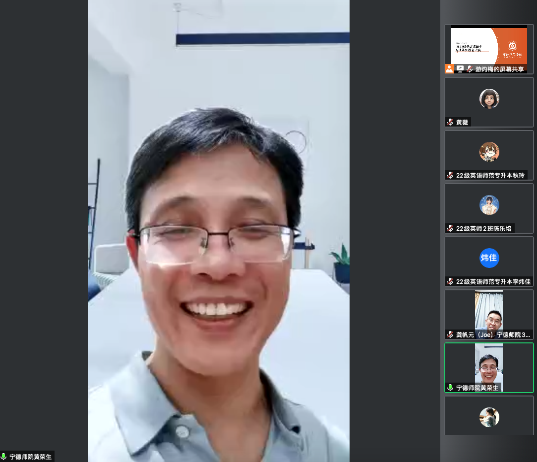 2022年9月15日晚上,英语系于腾讯会议线上召开了2022级英语专业新生教育大会,副经理黄荣生、副书记陶莉、专业带头人龚帆元、系主任游灼梅、系副主任黄薇及三位学习班主任等教师参加了此次动员大会,会议由游灼梅老师主持。