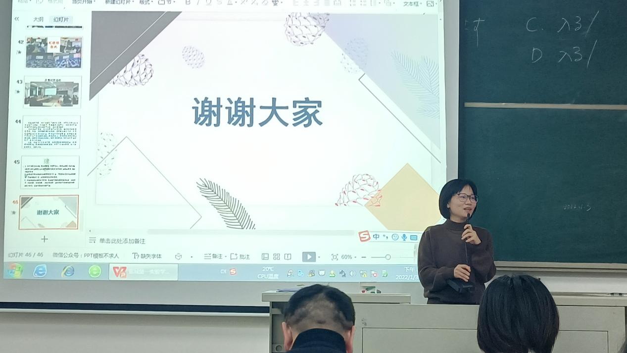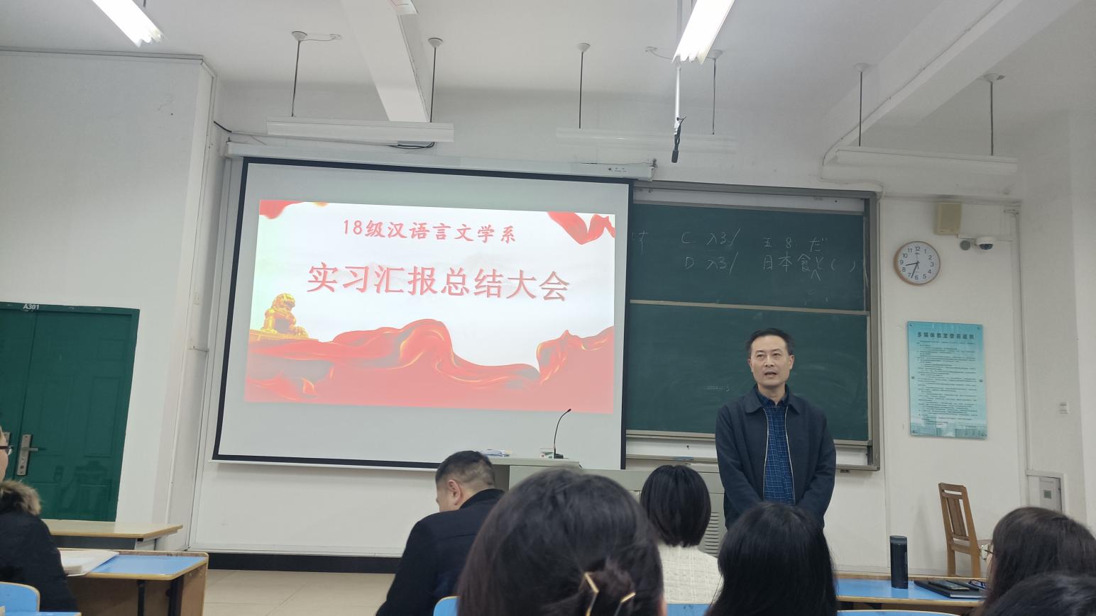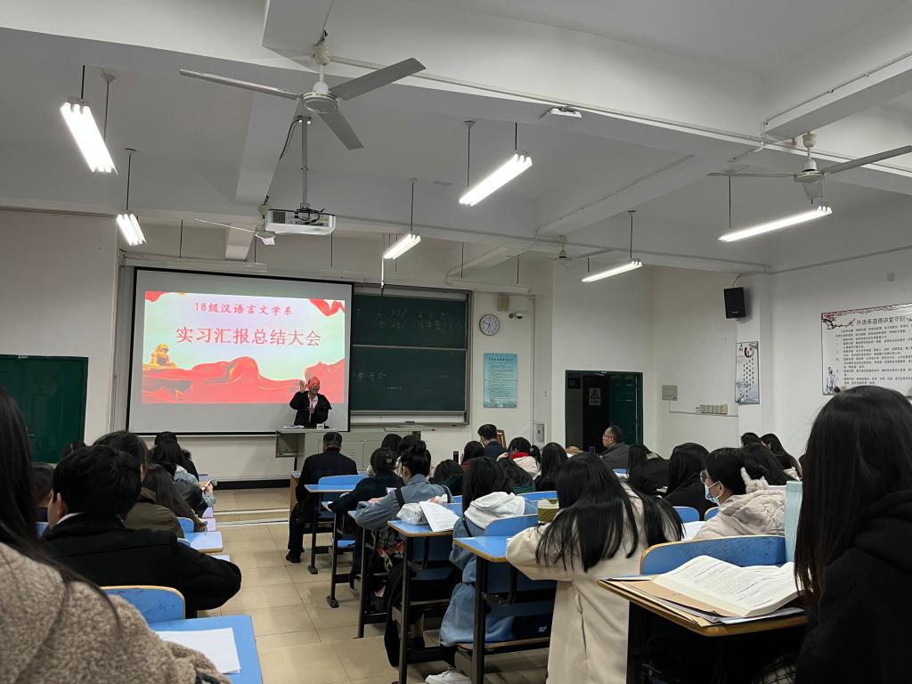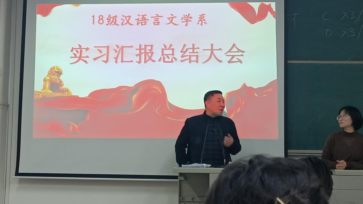 为展示教育实习成果,深化师范生对教师职业的认识,2022年1月3日晚,2018级汉语言文学(师范)专业全体员工集中语言与文化学院A区301教室开展实习总结汇报会。出席本次会议的有语言与文化学院经理赵峰老师,汉语言文学系系主任许陈颖老师,系副主任王经纬老师,徐晓春老师,禹剑老师等8位老师。
