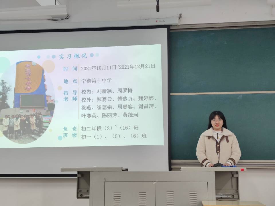 2018级英语(师范)专业蕉城中学,东侨中学,宁德十中,蕉城区第一实验学校四个教育实习队分别轮流开展了各组实习总结汇报,分别就实习学校概况、导师介绍、学科工作、班主任工作、以及实习生日常、校园工作等方面进行了总结汇报。黄薇老师对每个实习小组的总结进行了点评。