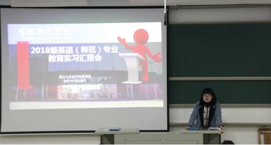 12月28日下午16时,2018级英语(师范)专业全体员工集中语言与文化学院A区301开展教育实习成果汇报会。语言与文化学院副经理黄荣生老师,语言与文化学院陶莉书记,林海英老师,黄薇老师,许秀玲老师、周罗梅老师等出席了此次汇报会。会议开始,黄薇老师先向大家介绍了英语师范专业的实习概况及实习总结阶段的后期具体工作。