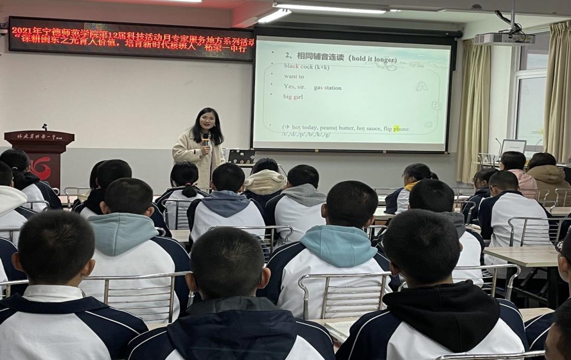 beats365亚洲版官网英语系教研室主任、外研社“教学之星”全国复赛一等奖获得者林丽丽讲师为柘荣一中志勤班学子开设了题为《英语发音土土的坑,你踩了吗?》的讲座,以自身的学习经历,精湛的专业素养演绎了英语发音的美妙,鼓励同学们要坚持学习、共同进步。