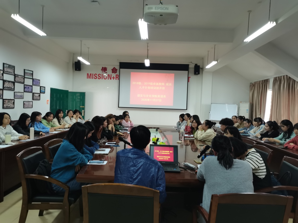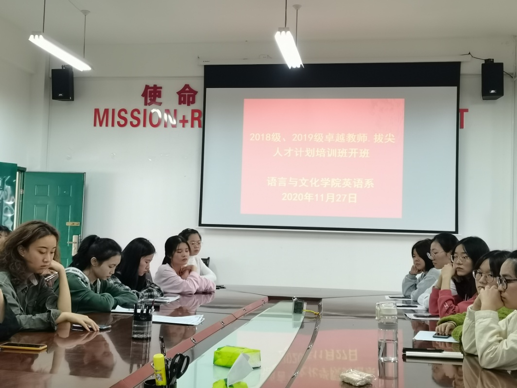 根据宁师院教【2019】11号文件精神,语言与文化学院英语系于2020年11月27日在AA407举行2018、2019级卓越教师、拔尖人才计划培训班开班仪式。分管教学副经理黄荣生、英语系正副主任游灼梅、黄薇、教研室主任刘晖、尤斌斌、部分培训教师及参与该计划的2018、2019级的41位员工参加开班仪式,仪式由游灼梅主持。