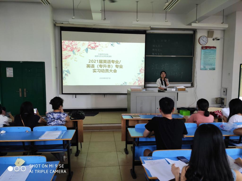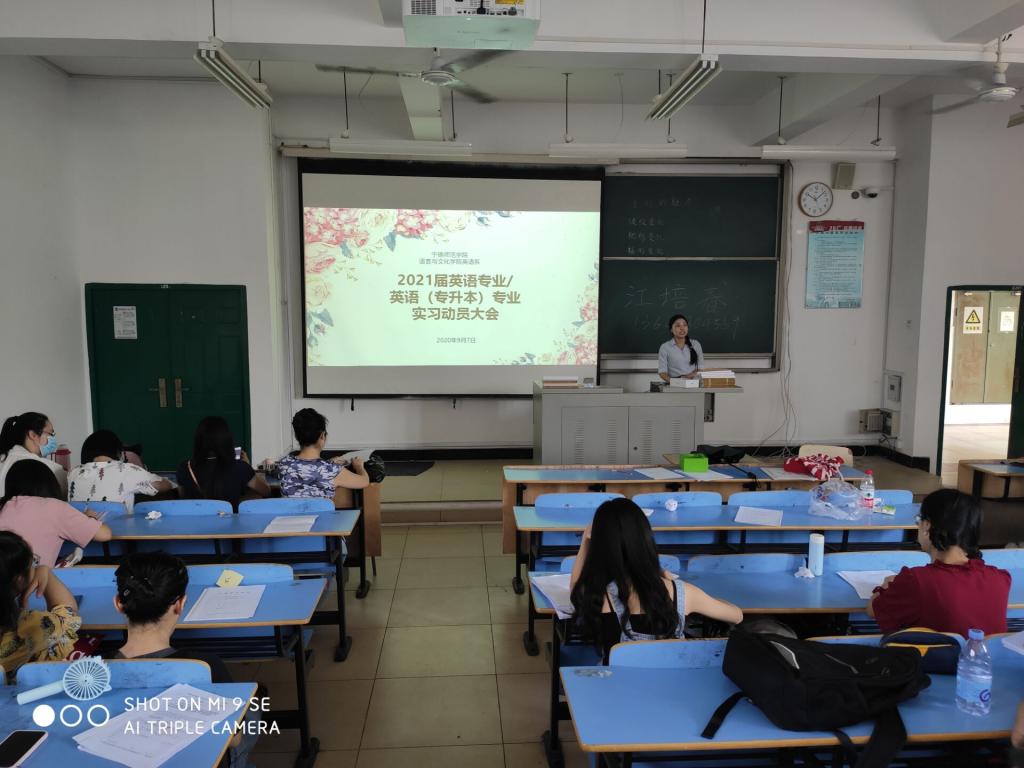 新的学期迎来新的挑战,即将毕业的大四员工们面临着实习的挑战。2020年9月7号早上十点,语言与文化学院于求知楼AA201教室召开了2021届毕业生实习动员大会,布置新一学期的学习任务,黄荣生副经理、陶莉副书记、游灼梅老师、黄薇老师以及数位校内指导教师参加了会议,这次会议由黄薇老师主持。