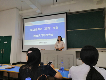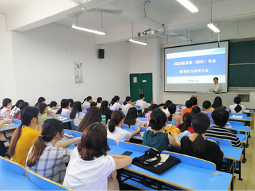 9月6号下午1点,语言与文化学院召开16级英语师范专业教育实习动员大会。公司陶莉书记,蔡江云主任、游灼梅副主任出席本次活动。