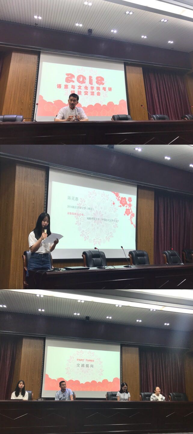本次会议旨在让广大同学对考研有更深入的了解,帮助同学们及时解决和处理在考研中遇到的各种困难和问题。首先由陈灵惠、杨娜、卢梦萌、杨金佳四位学长学姐分享他们的经验,介绍了一些考研参考资料和他们的学习方法,以及学习时间的分配,其中四位学长学姐都提到最重要的一点就是要有毅力,多刷真题,并且充分利用网上资源,端正考研态度,打好坚实的基础,方能获得成功。