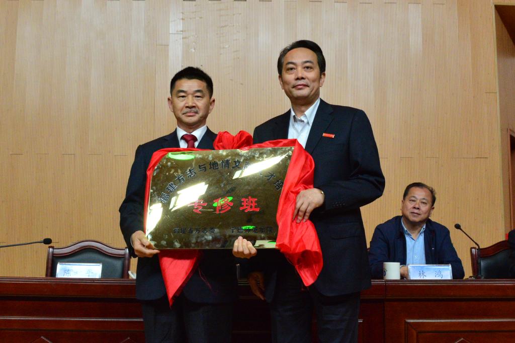 开班仪式上,还进行了福建方志与地情文献人才培养专修班的授牌,福建省地方志编撰委员会主任陈秋平授牌,语言与文化学院经理龚帆元接牌。