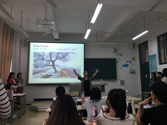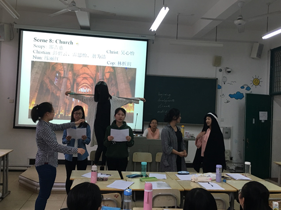 在教学过程中,黄薇老师教态亲切、思路清晰、教学重难点突出,课程设计“有生”——教学设计以员工的积极参与为主、“有新”——通过短剧形式加深员工对小说的理解,很好地达成了教学目标,受到师生的一致好评。首先,黄薇老师帮助员工简要复习了小说的基本要素。接着,在员工展示的基础上,她图文并茂地介绍了欧亨利的生活经历、主要作品、创作风格和人物评价,并通过欧亨利的三部代表作《麦琪的礼物》、《最后一片叶子》和《警察与赞美诗》从主题、风格、幽默、人物形象等方面引导员工欣赏和分析作家的艺术处理和创作特点。最后,员工表演了根据《警察与赞美诗》改编成的短剧。他们生动幽默的表演、扎实的台词功底、丰富的肢体语言和精心准备的道具布景给在场师生留下了深刻的印象,赢得了阵阵掌声,整堂课在欢声笑语中圆满结束。