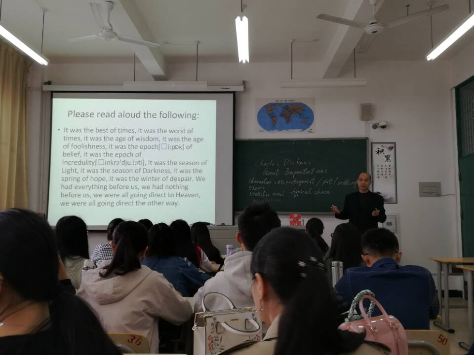 11月28日下午,英语系的李俊宇老师在求知楼A306开设了一堂《英国文学》课程的公开课,课程主题为英国小说家狄更斯和他的著作《远大前程》。英语系两个教研室的老师们参加了公开课观摩活动以及课后的评课教研活动。