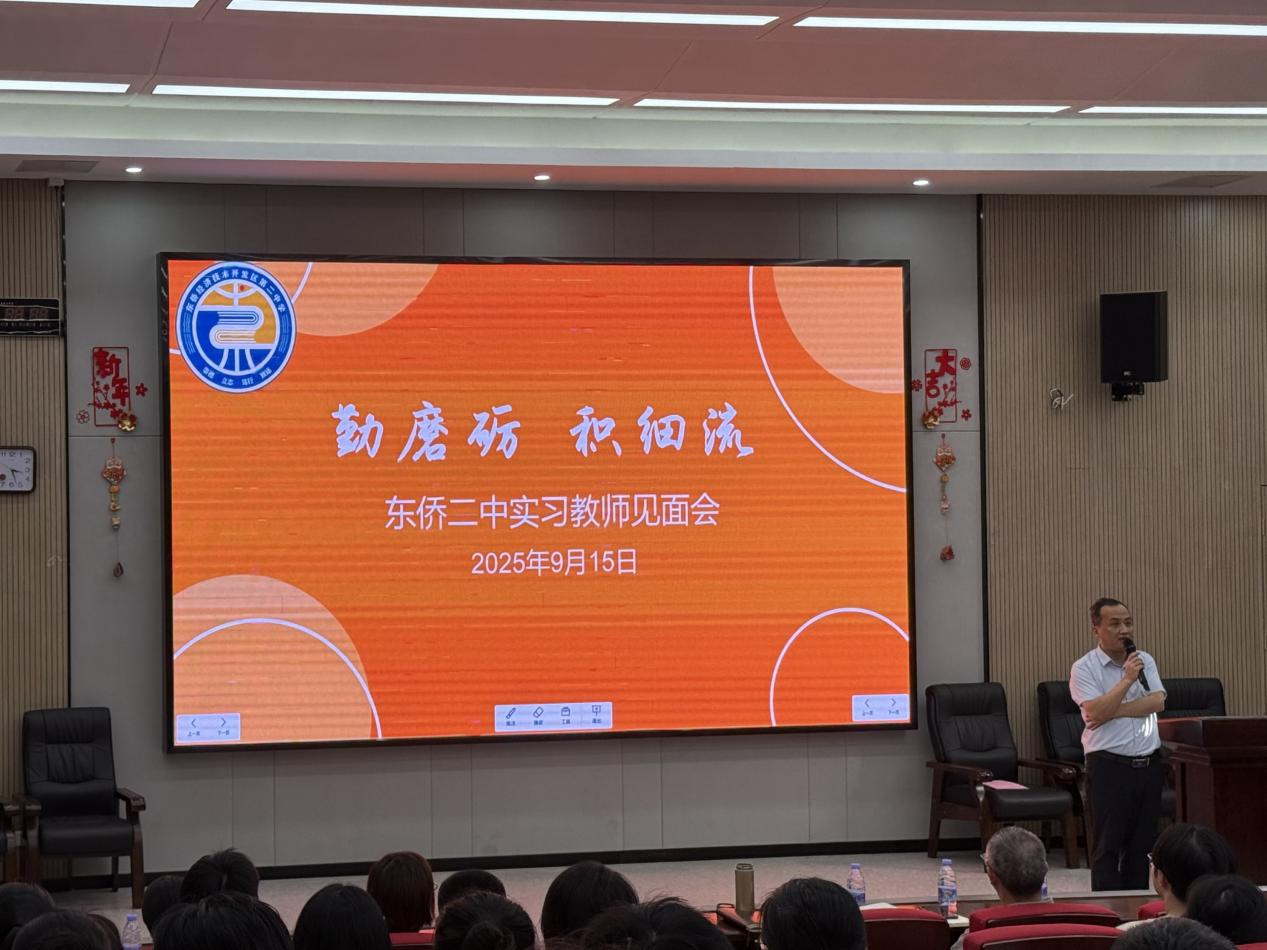 2025 年 9 月 15 日下午三点,beats365亚洲版官网英语系 2026 届英语(师范)专业实习队的 20 名成员,在带队教师黄薇老师与林少晶老师的带领下,精神饱满地抵达东侨经济技术开发区第二中学(以下简称 “东侨二中”)。当天,学校专为实习队召开 “2025 年东侨二中实习教师见面会”,鲜红的欢迎横幅悬挂在会议室门口,细节间满是对实习生的重视,也标志着本次集中实习工作正式拉开序幕。