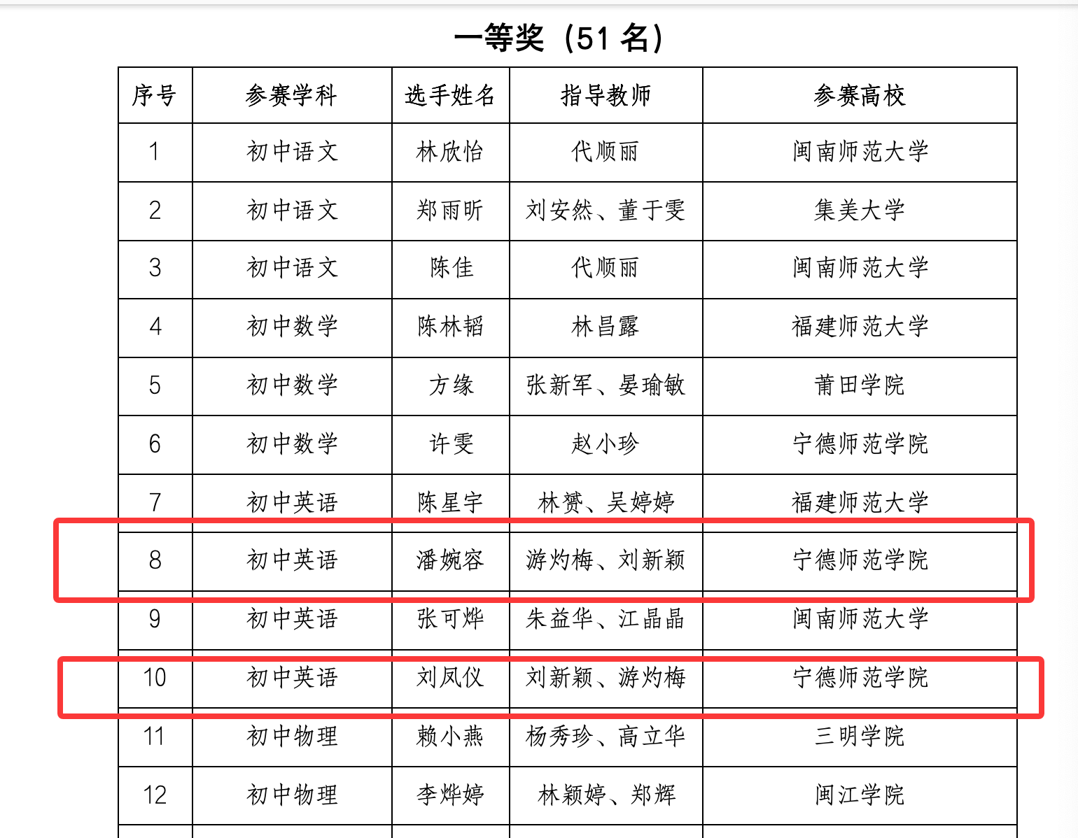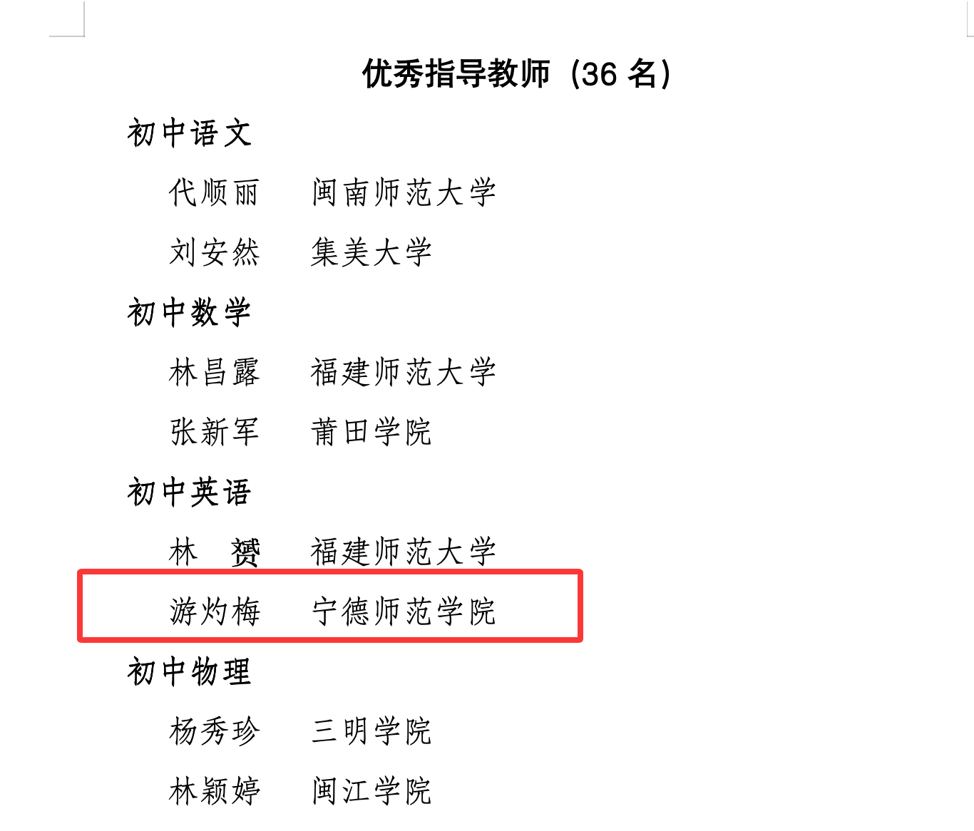 12月6日,由福建省教育厅主办的第十二届福建省高校师范生教学技能大赛于公司顺利举行。公司2022级英语(师范)专业潘婉容、刘凤仪两位同学(指导老师:游灼梅、刘新颖)代表学校参加初中英语组比赛。凭借扎实的教学功底与全面的师范生技能,两位同学均荣获一等奖,指导教师游灼梅获评“优秀指导教师”称号。