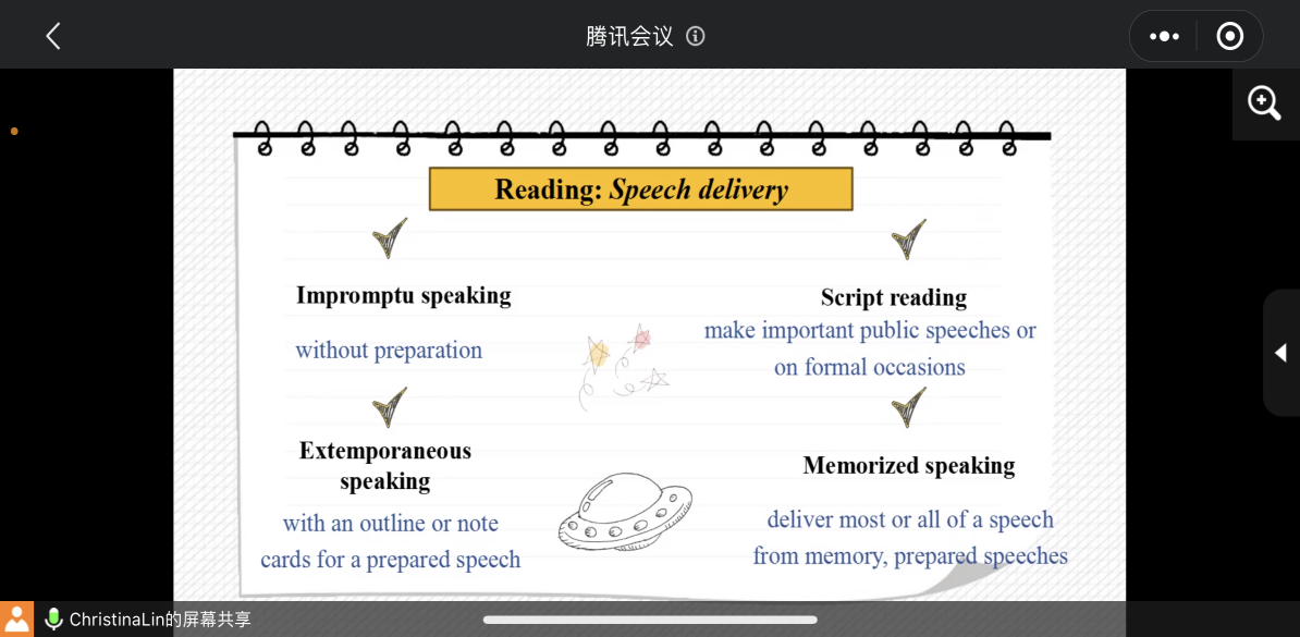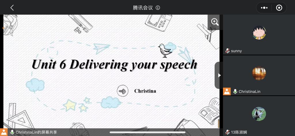 2022年5月10日上午,公司英语系林丽丽老师以腾讯会议直播形式开设了一场《英语演讲》教学公开课,授课对象为2021级英语(师范)2班的全体员工,英语系教师及员工代表参与了听课及评课活动。