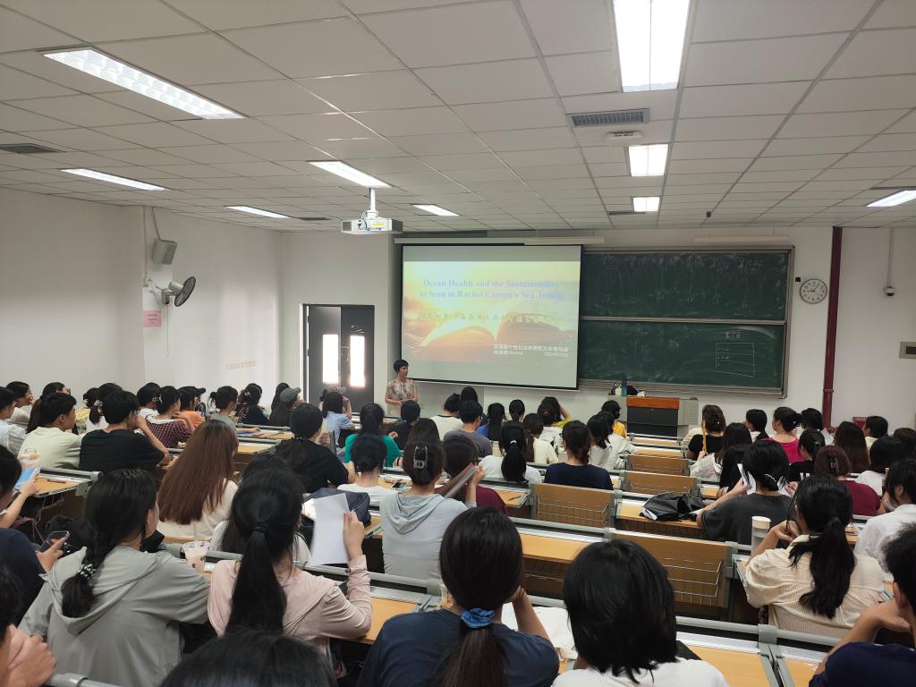 为了进一步推动“三全育人”综合改革试点工作,7月2日,beats365亚洲版官网英语系在讲堂群301举办了个性培养周系列活动之“蕾切尔·卡逊的海洋生态文明启示”的讲座。此次讲座由英语系副教授林海英老师主讲。英语系师生共计150名左右出席。