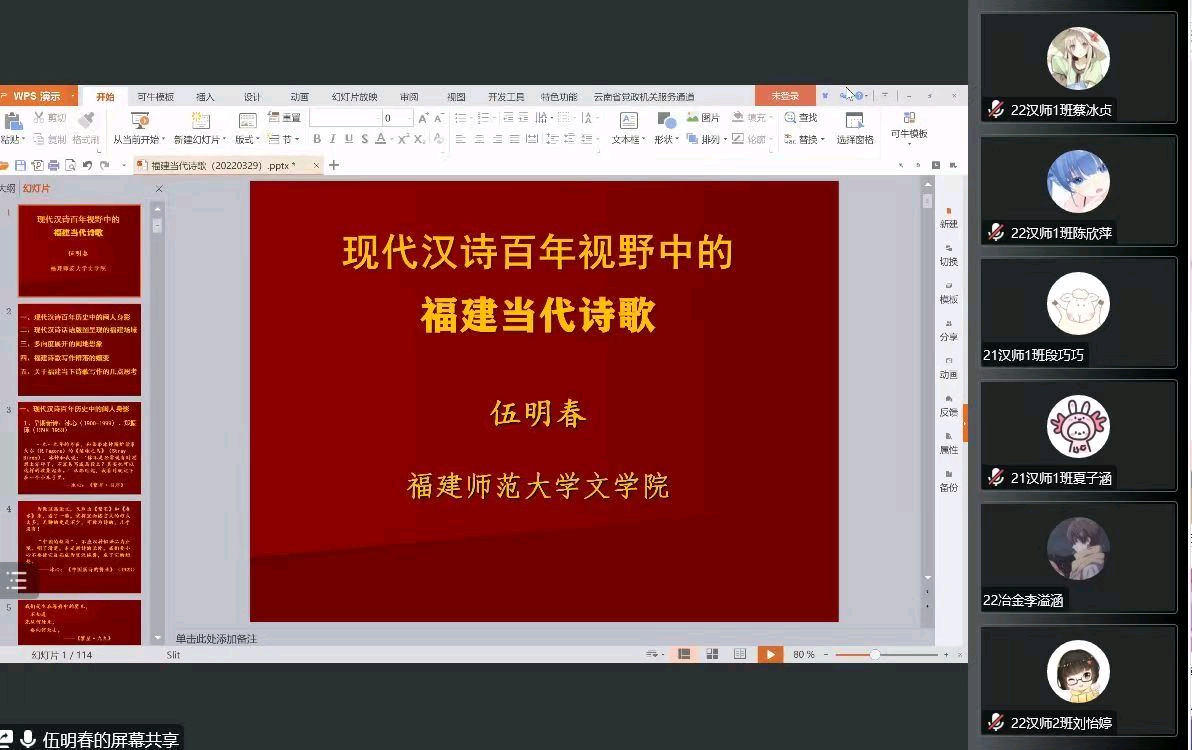“冰心的《繁星》,林徽因的《你是人间四月天》,新月派的出现,白话诗的发展”伍明春教授为同学们讲解当代著名文学作家的作品和历史背景,加深同学们对福建当代诗歌的理解与认知。