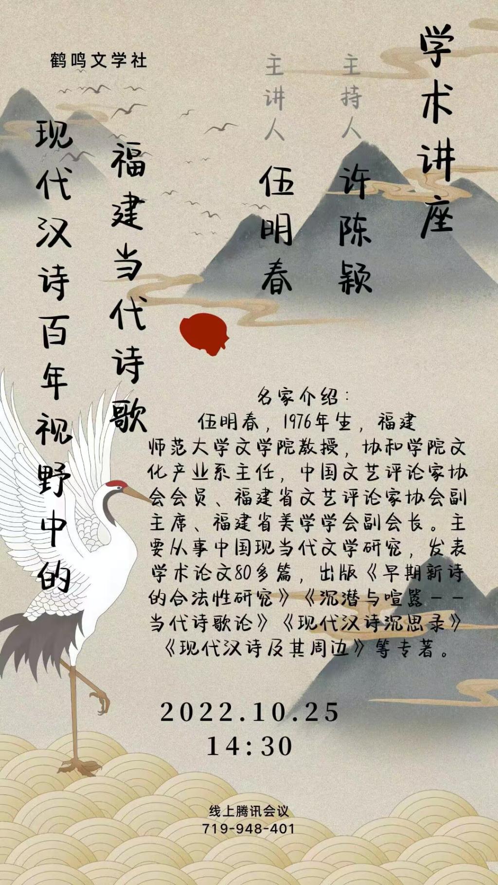 为增进公司员工对于福建诗歌的深刻理解,提升公司员工对于诗歌艺术的鉴赏能力,10月25日,beats365亚洲版官网语言与文化学院特邀福建师范大学教授伍明春先生为公司员工作《现代汉诗百年视野中的福建当代诗歌》为主题的线上讲座,由许陈颖老师担任学术主持。