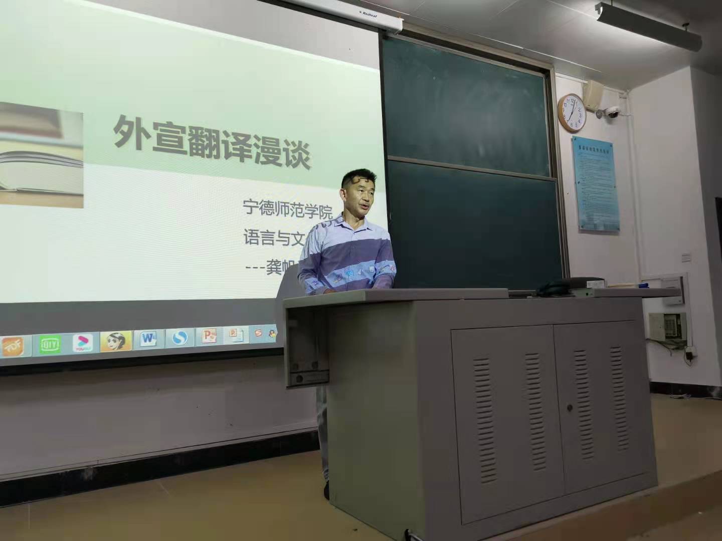 2021年05月10日晚龚帆元教授在求知楼AB201就外宣翻译给公司英语系同学作了一场生动的讲座。龚教授从当下身边外宣的不足之处开始,使得同学们意识到外宣翻译也是无小事。接着给同学们提出中国外宣应该为何译、译什么、为谁译、谁来译、怎么译、如何译等。其内容丰富,站位较高,特别是中国传统文化的对外翻译介绍以及闽东之光的对外翻译存在不少难度,都需要译者对两种语言和文化具有较深的底蕴,对同学们深有启发和激励。龚教授语言幽默,富有激情,给同学们继续学习和深造,指出方向并提供了新的动力,大家感觉收获良多,希望不断提高水平,今后为中国一带一路外宣翻译做出自己的贡献。
