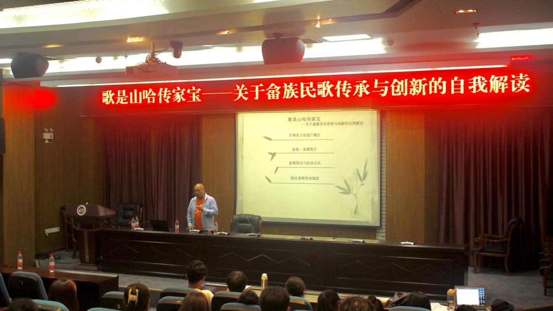 2021年4月28日晚,为弘扬畲族传统文化,提升公司师生对畲族文化的认识与了解,语言与文化学院邀请中国音乐家协会会员、中国曲艺家协会会员、闽东革命纪念馆馆长、畲族民歌传承人雷志华开设《歌是山哈传家宝——关于畲族民歌传承与创新的自我解读》讲座。