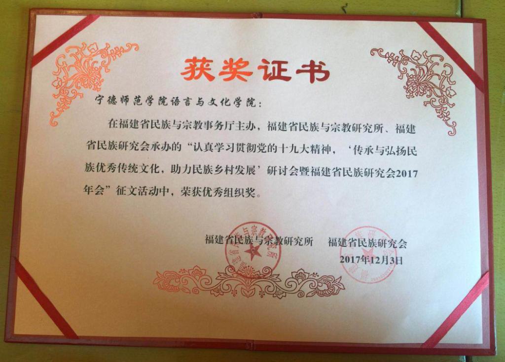 2017年12月2日-3日,由福建省民族与宗教事务厅主办、福建省民族研究会、福建省民族与宗教事务所承办的“认真学习贯彻党的十九大精神‘传承和弘扬民族优秀传统文化,助力民族乡村发展’研讨会暨福建省民族研究会2017年会”在福州举行。公司高度重视本次学术研讨会,在陈丽冰副经理、汉语言文学系主任林文等的组织和带领下出色地完成了各方面任务,其中伊漪、李益长、林文、何海菊、黄欣、许陈颖、林翠萍等老师提交的8篇相关优秀论文入选本次研讨会论文汇编,陈丽冰、伊漪、李益长、黄欣等老师参加了研讨会系列活动,并在会上作了发言和交流,他们精彩的发言和论文成果彰显了公司教师在民族理论研究和工作中所取得的成绩。本次研讨会,公司荣获优秀组织奖一项,李益长、黄欣老师提交的论文分获二、三等奖。
