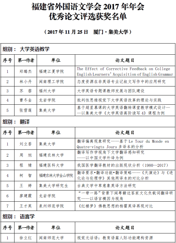 11月24日至25日,公司龚帆元经理、李俊宇老师一行参加了在厦门举行的2017年福建省外国语文学会年会。本次会议由福建省外国语文学会主办,集美大学外国语学院承办。会议主题为:“国家发展和外语工作者的使命”。国立澳洲大学中文系范圣宇博士、大连外国语大学赵永青教授、广东外语外贸大学任伟教授、厦门大学戴鸿斌教授分别在会上做了精彩的讲座。在下午的分组讨论会上,龚帆元教授与吴玉玲教授主持了应用语言学组的论文交流与讨论。