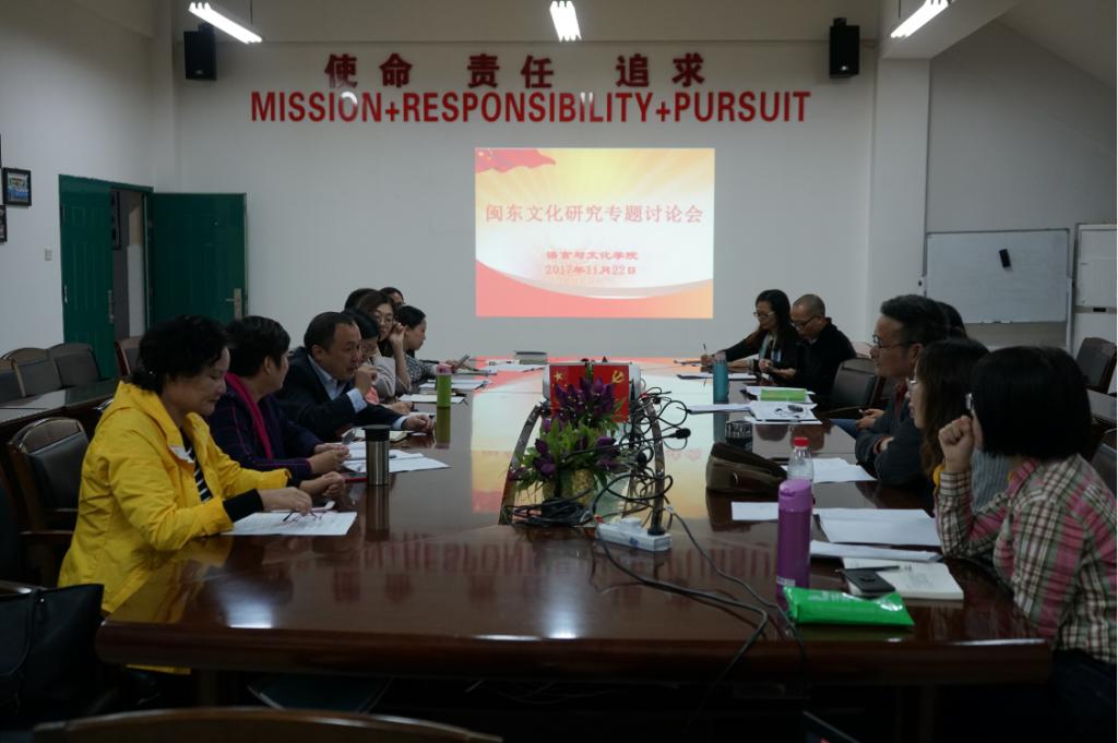 语言与文化学院成立以来,闽东文化研究专题第一次研讨会于2017年11月22日下午3:30在求知楼AA407举行,语言与文化学院副经理陈丽冰主持会议,闽东文化研究中心主任伊漪教授、陈开福常务副主任及陈靖姑文化研究团队、畲族村落文化研究团队的成员参加了讨论会。