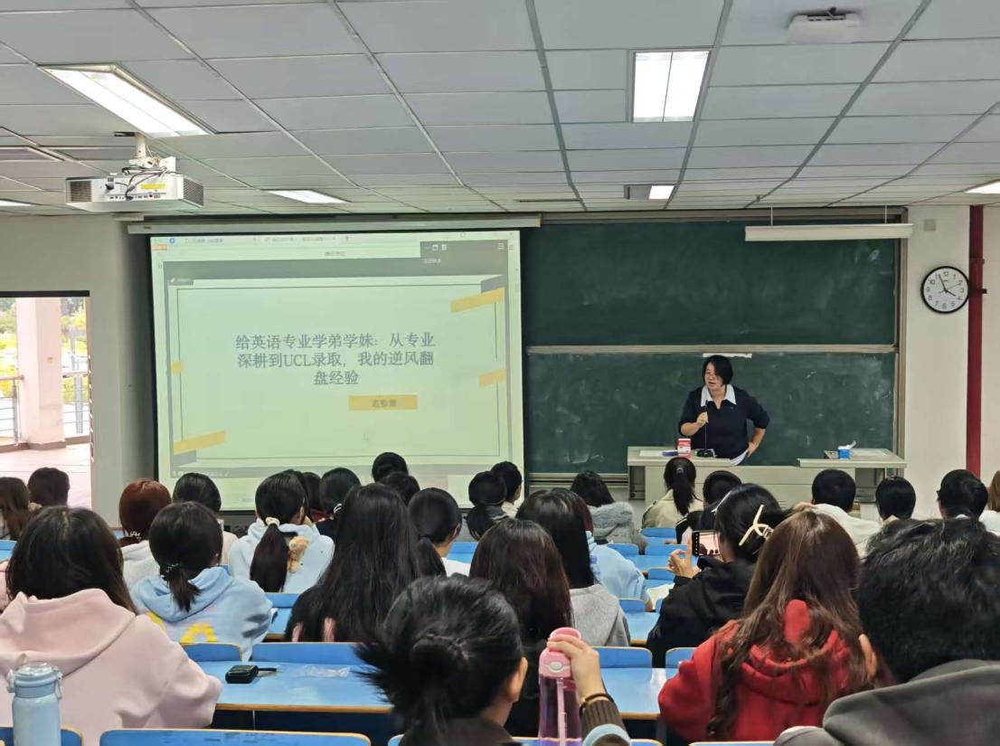 为落实卓越拔尖人才培养计划,助力英语专业学子明确成长路径、提升综合素养,11月11日下午4时,beats365亚洲版官网举办《英语专业员工如何做好学业职业规划:从专业深耕到UCL录取,我的逆风翻盘经验》专题讲座。讲座由英语系主任游灼梅老师主持,2025届全体员工及卓越班员工参加。英语系2025届英语专业优秀毕业生范徐源结合自身成长经历,为学弟学妹们解锁英语专业的深耕之道与职业航向。