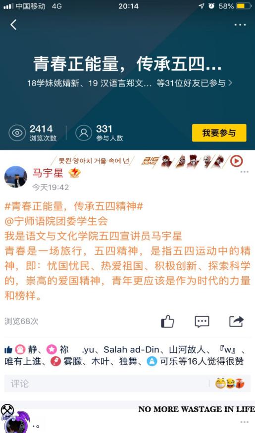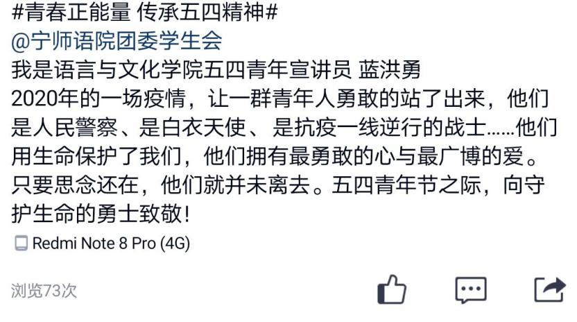 2020年5月4日是第71个中国青年节也是五四运动101周年纪念日。为引领新时代青年继承弘扬五四精神、正确认识责任使命,语言与文化学院开展了以“青春正能量 传承五四精神-我是五四精神宣讲员”为主题,以在QQ空间打卡发送与五四及抗疫英雄相关的小故事小知识为活动形式,重温五四岁月、讴歌抗疫战士。本次活动得到了全体同学的积极参与、热情响应,浏览次数高达2414人次,参与人数共计331人。