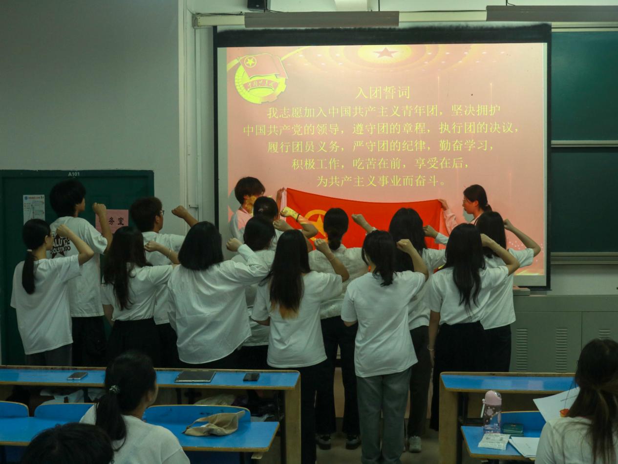 会上,院团委书记元佳珺宣读了新发展团员名单,并对新发展入团的青年表示祝贺。院团委委员为12名新团员颁发佩带团徽,院团委副书记文艺洁带领新团员进行入团宣誓。