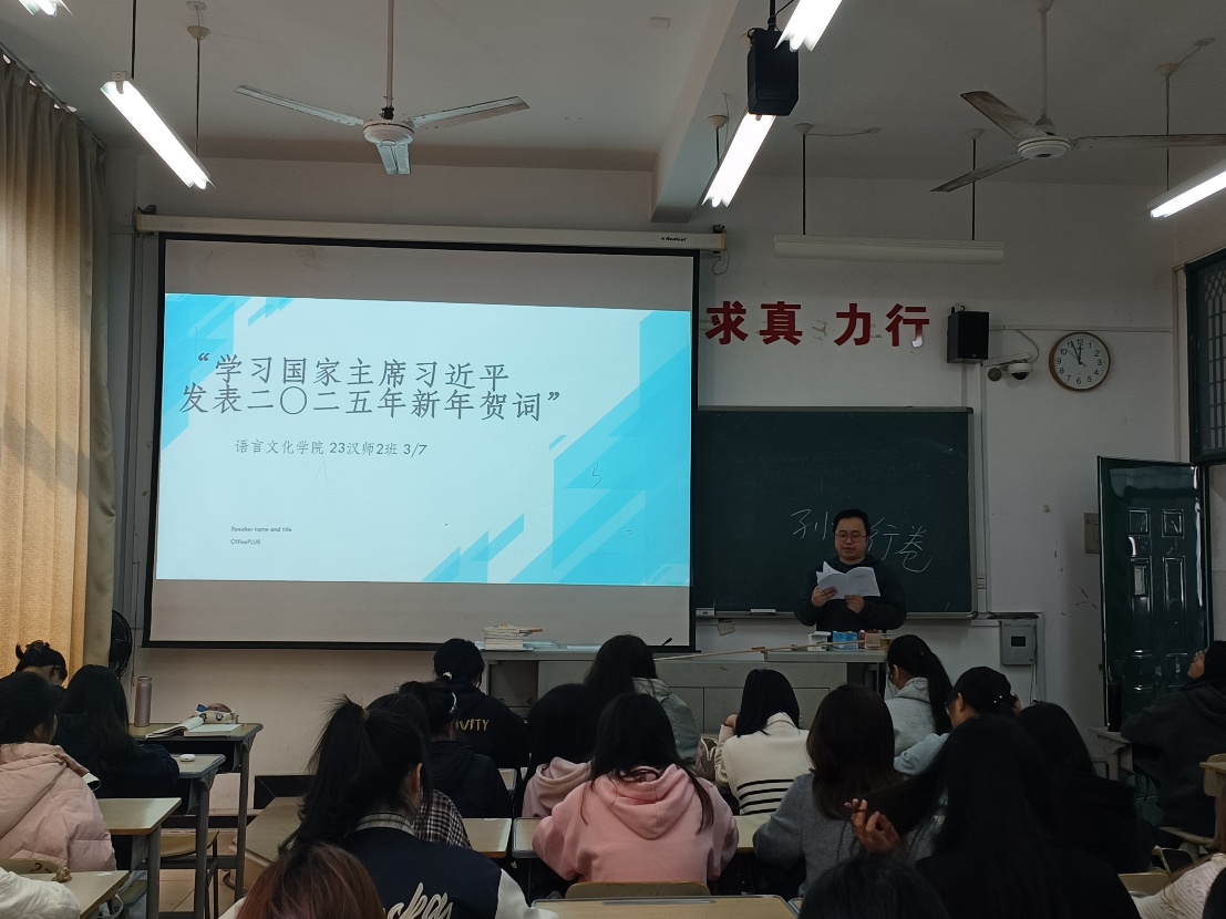 主题班会上,各辅导员播放了国家主席习近平二〇二五年新年贺词的视频,让同学们直观感受讲话氛围,并带领同学们逐段学习了新年贺词的内容,重点讲解了国内经济发展、科技创新、民生保障、国际形势等方面的亮点和成就。辅导员还结合当前社会热点和班级实际情况,提出了具体的学习计划和行动方案,鼓励同学们在新的一年里不断进取、追求卓越。