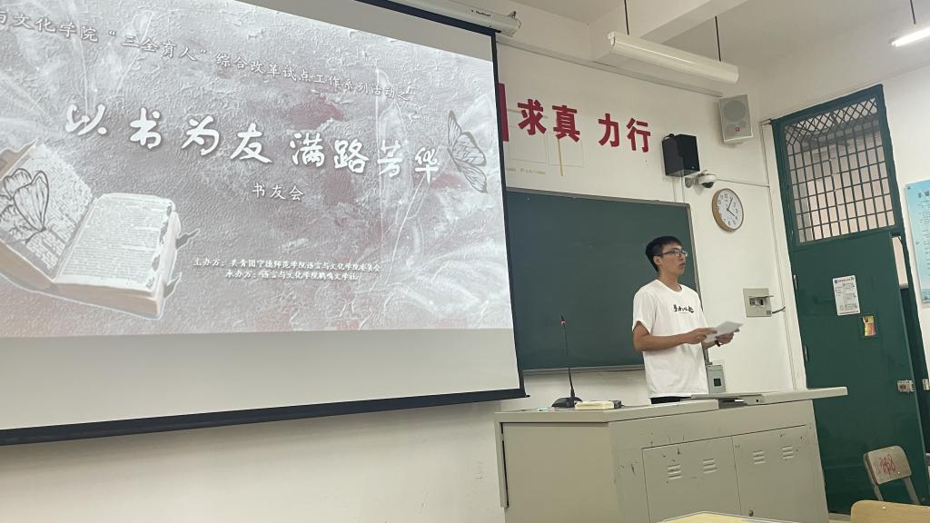 为推进语言与文化学院“三全育人”改革试点建设,提升员工的文学素养,促进校园文化建设,2023年10月31日,鹤鸣文学社在求知楼举办以“以书会友,满路芳华”为主题的书友会活动。会上,同学们以小组讨论的方式,各自分享了自己对书中内容的感悟和理解,通过撰写推荐稿、书籍交换的形式,将自己独到的阅读体验传递给其他人,让更多的人了解到阅读的乐趣和价值。