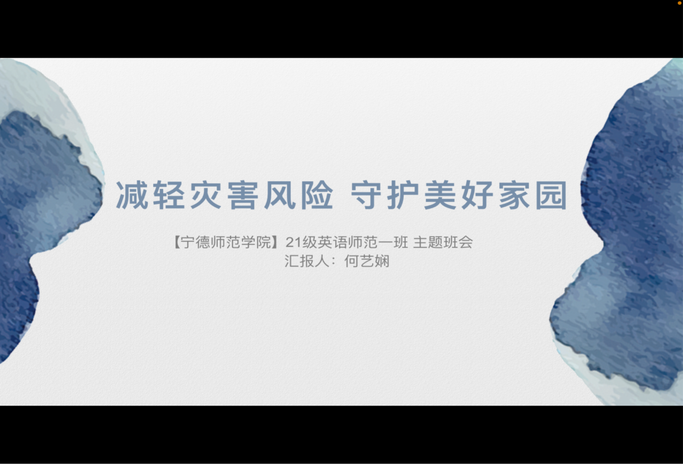 蓝艺梅(19汉语言文学(师范)1班):未雨绸缪,防患未然,是安全教育永恒不变的基石;保障生命,尊重生命是安全教育永恒不变的主题。大家都知道,自然灾害的发生是人类无法抗拒的,但是人们可以通过有效的措施把自然灾害造成的损失降到最低限度。所以为了使员工了解并掌握必要的防灾减灾知识,我们特此召开“减轻灾害风险,守护美好家园”主题班会活动,希望同学们在突遇危急情况时能够进行一些有效的举措,从而保护自己减少伤害。同学们也要在努力保障自己生命安全的前提下,尊重他人的生命权。当危险突然来临时,不能自私自利夺路而逃,更不能为保障自己的生命权而恶意损害他人的生命权。要服从指挥,从容镇定,遵守秩序,让所有人在最短的时间内撤离到安全的地方。愿警钟长鸣,生命之树常青。