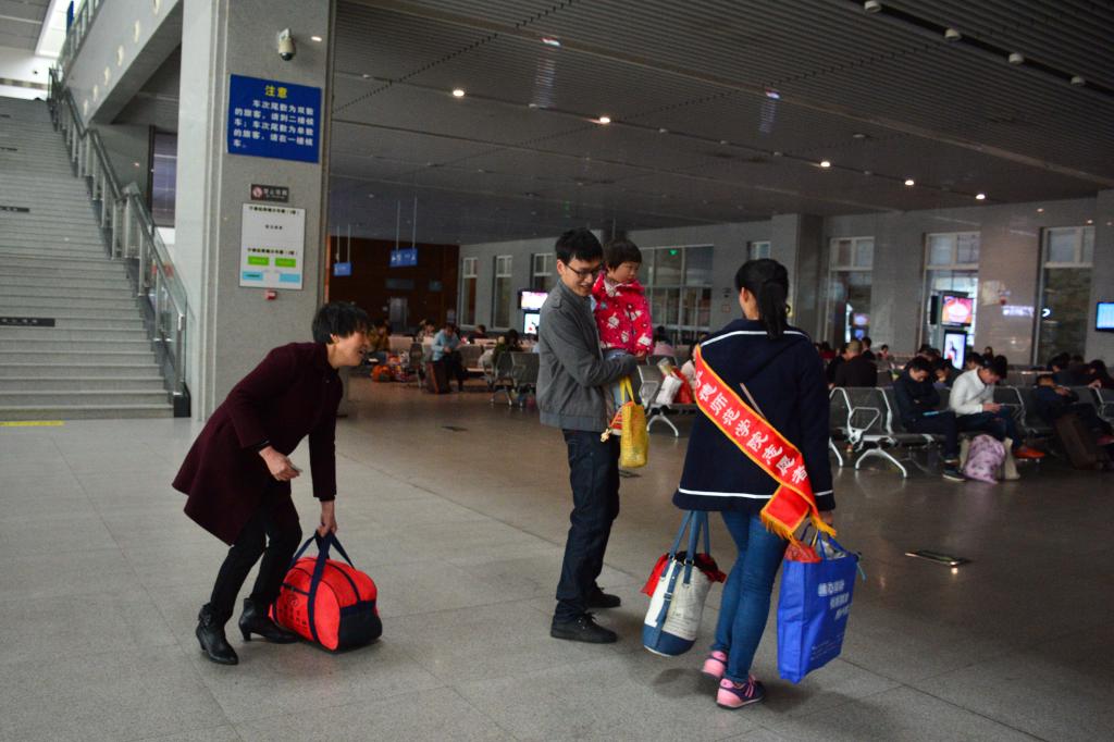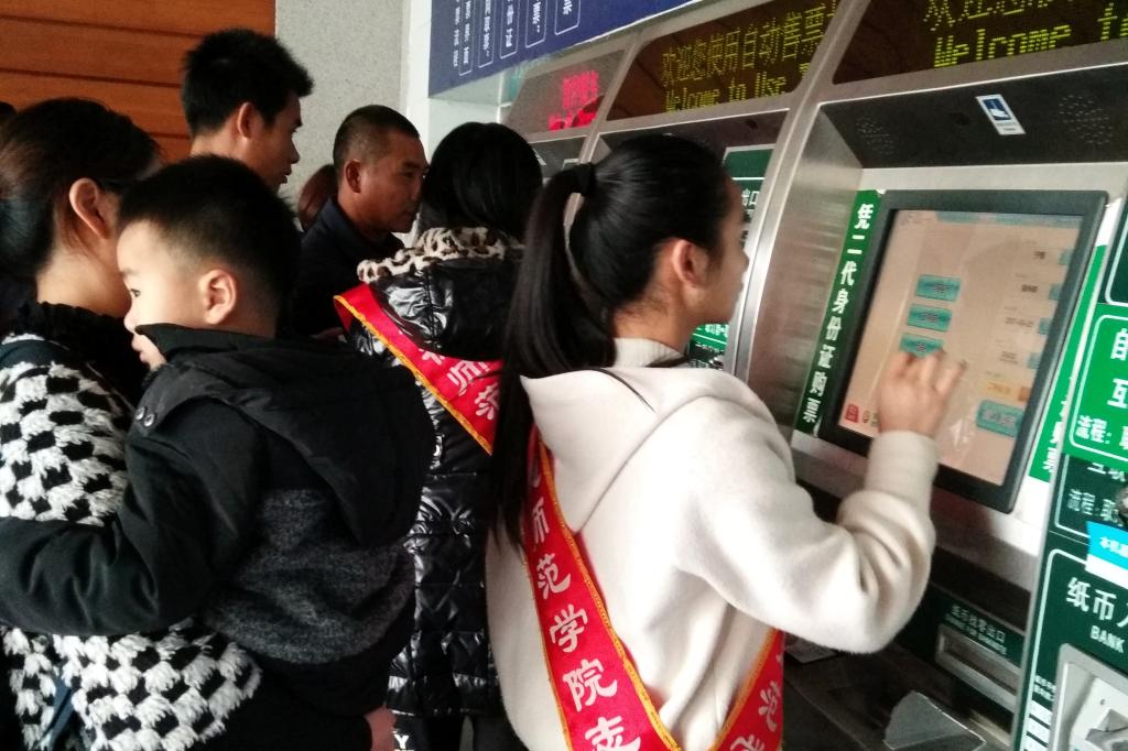3月25日,汉语言文学系16级网媒班的13名志愿者,到宁德市动车站参加“学雷锋动车站志愿行”活动。他们分成三个小分队,在售票处第一组指导旅客购票;第二组负责在进站口帮助有需要的旅客将行李拿进候车厅;第三组则在出站口为旅客提供相关志愿服务。