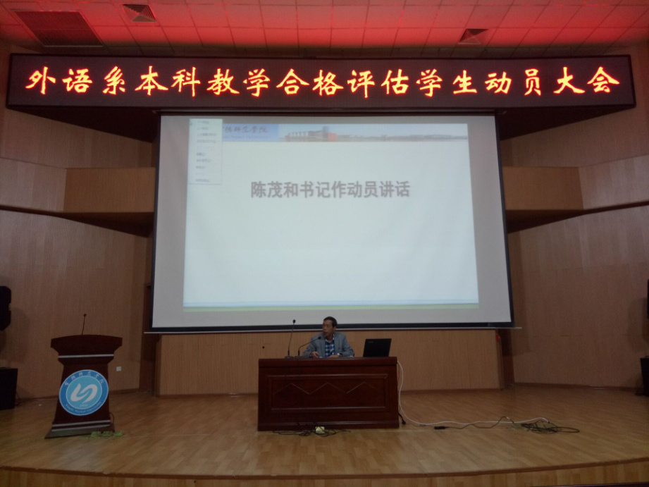 为了迎接本科教学工作合格评估专家入校,创建更加美好的生活学习环境,11月9日晚6点半,英语系迎接本科教学工作合格评估员工动员大会在图书馆报告厅举行。英语系党总支书记陈茂和、副主任黄荣生、辅导员元佳珺、王晓莹出席了本次会议,并分别上台讲话。英语系全体员工参加了此次会议。