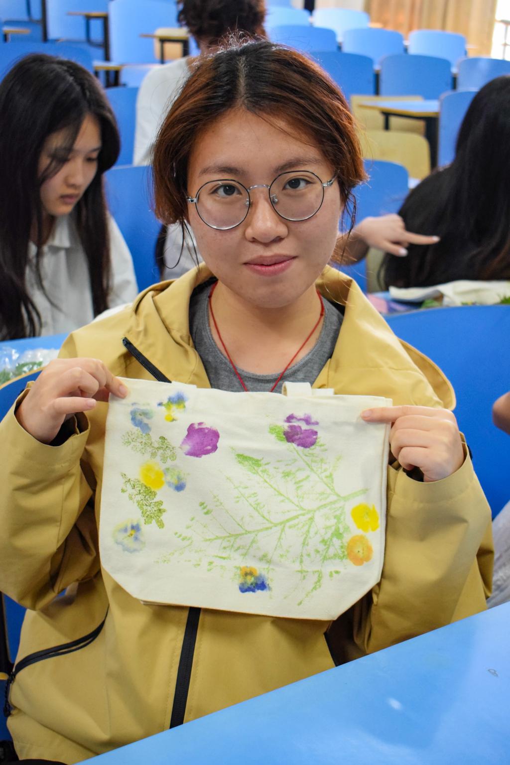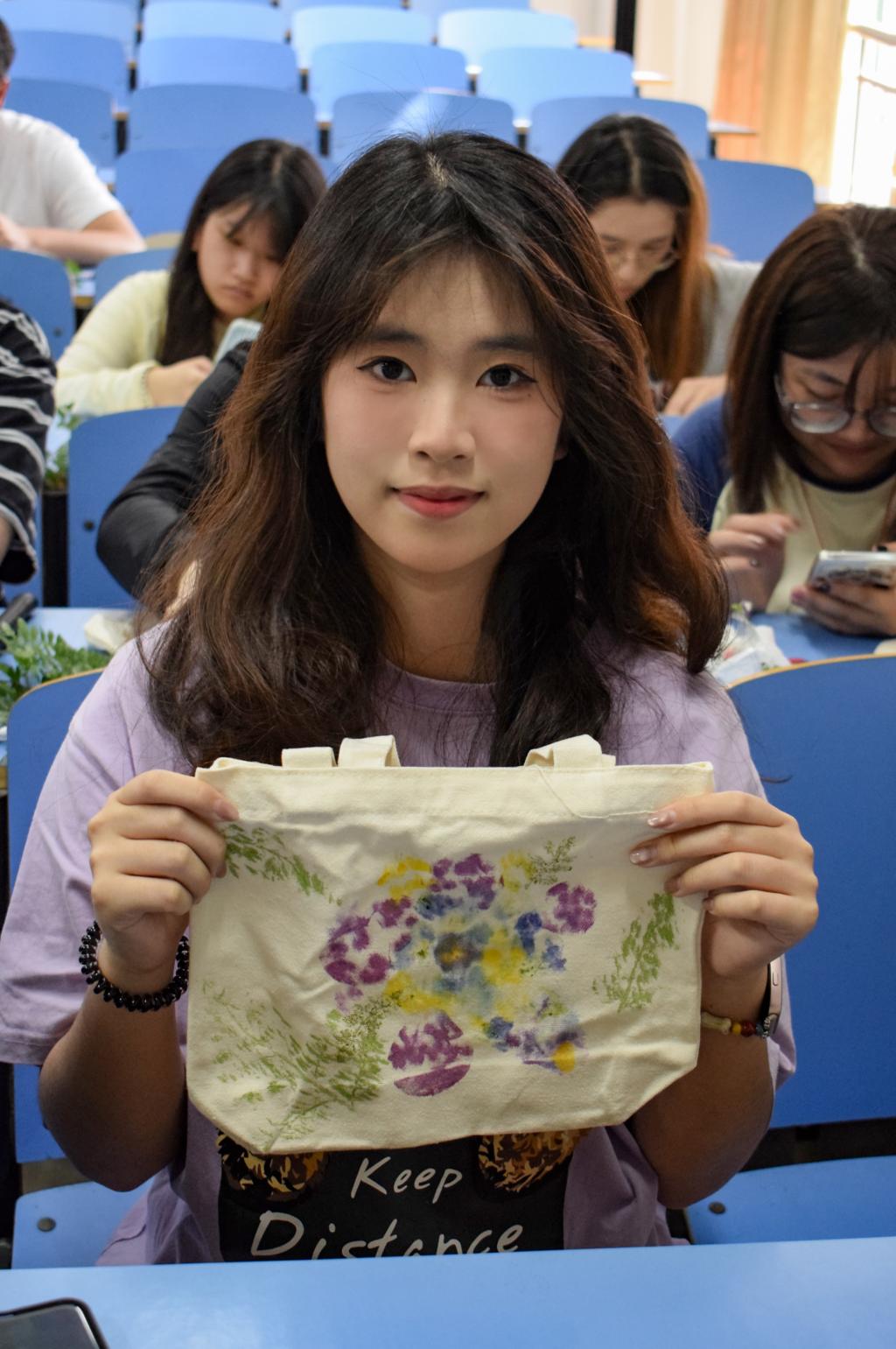 活动中,成员们热情高涨。大家精心挑选形态各异的花草,巧妙构思布局,将其摆放在帆布袋之上。在锤子的轻敲慢打下,花草的脉络与色彩逐渐渗透到织物之中,一幅幅充满创意与巧思的自然画作应运而生。期间,大家相互交流灵感,分享制作经验,现场氛围热烈而融洽。