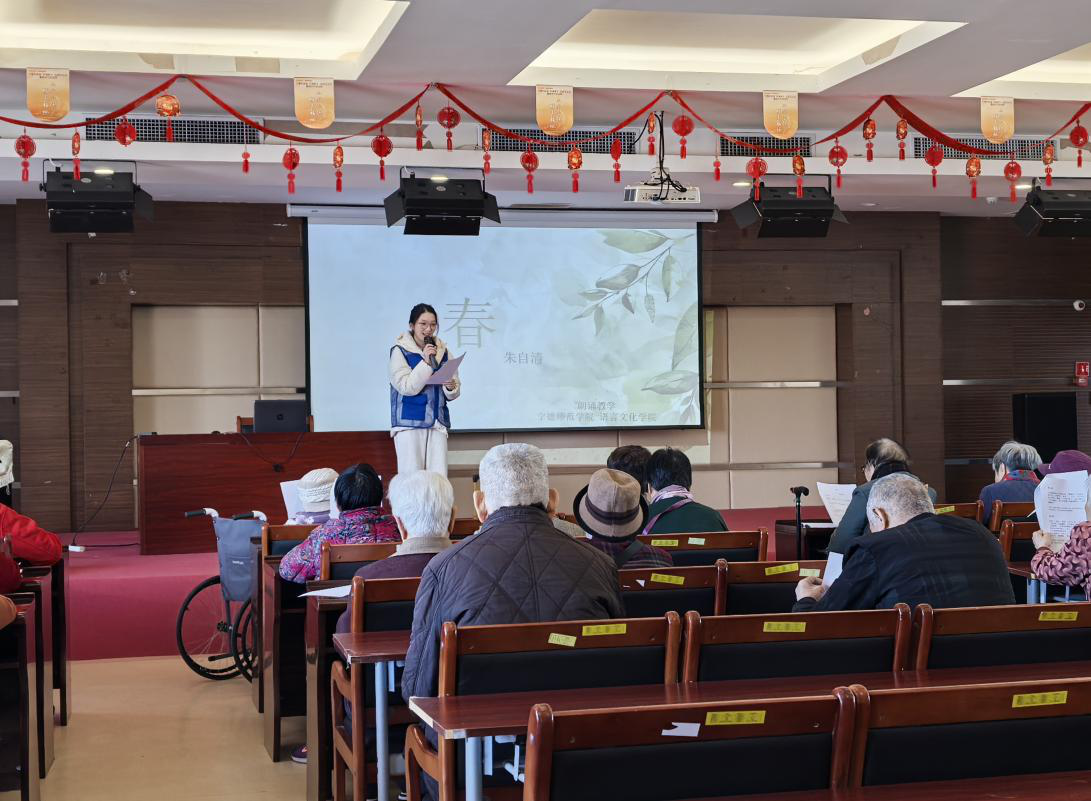 在志愿者的耐心陪伴和鼓励下,老人们逐渐融入《春》的意境之中,轻声跟读,面带微笑。他们专注的眼神、轻声的附和,不仅表达了对文学之美的欣赏,更流露出对生活、对自然、对时光的深切热爱。